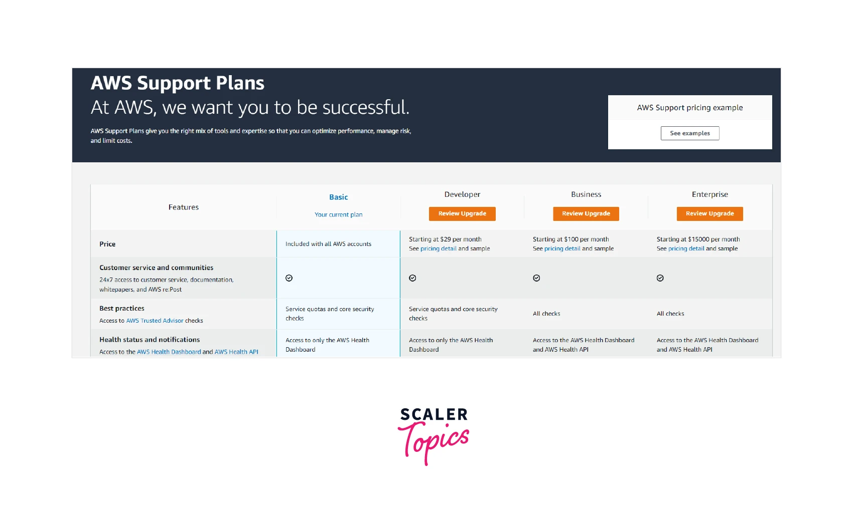 The basic plan is included in all the AWS accounts by default. Customers will have the option to upgrade to any one of the four support plans. Each support plan provides unique support. The price will vary based on the customer's opting for the support plan.
