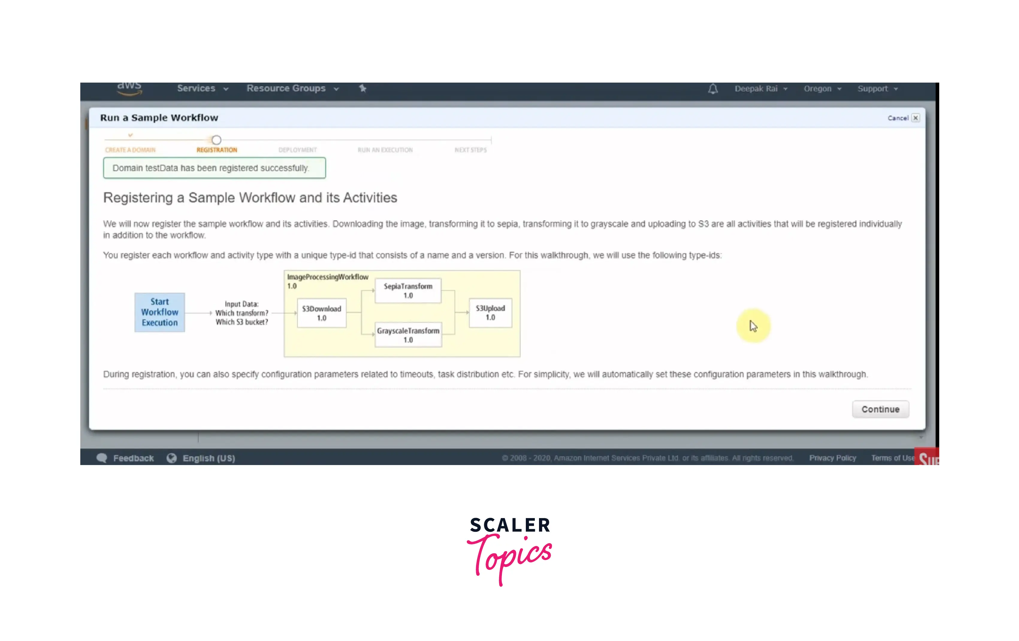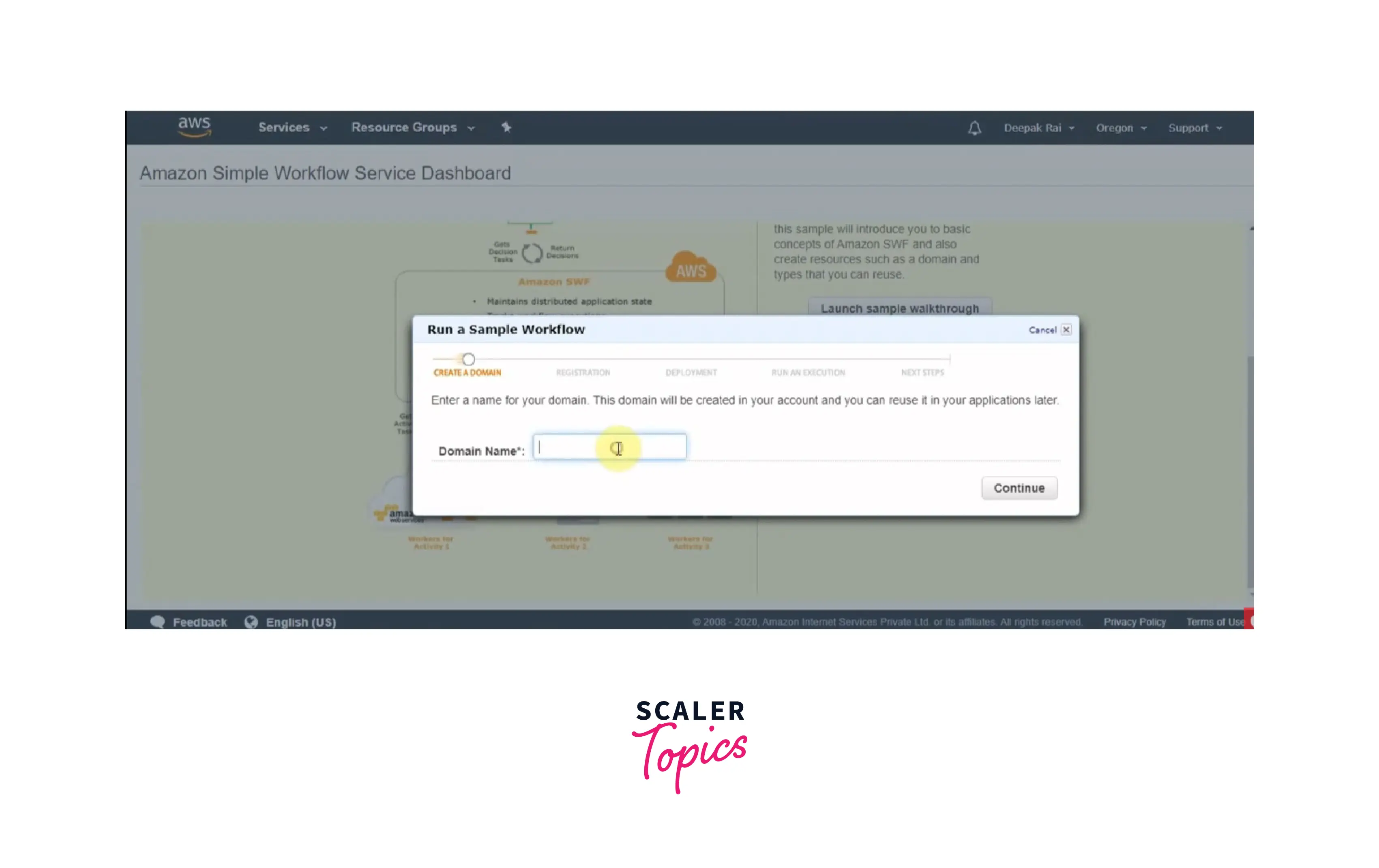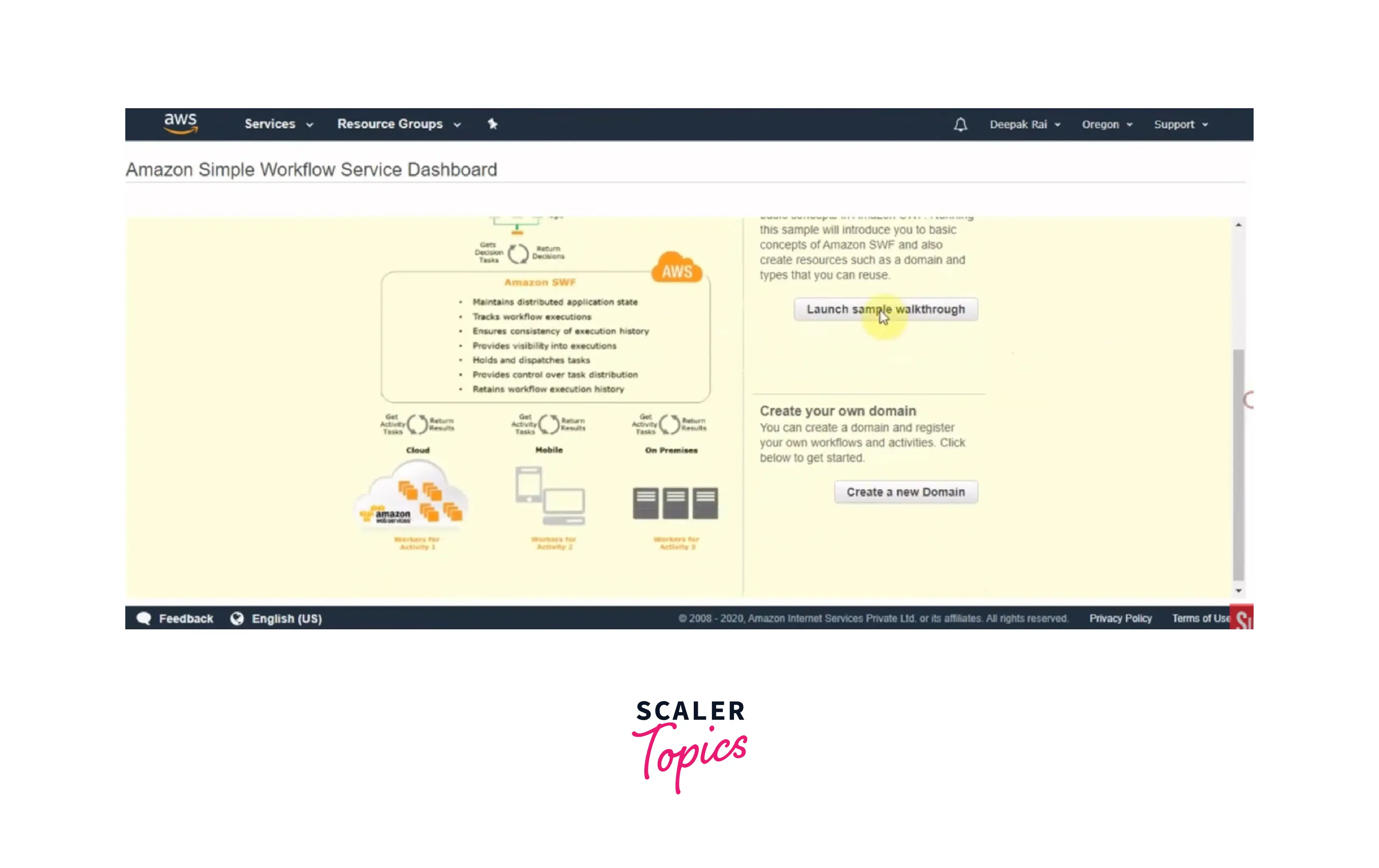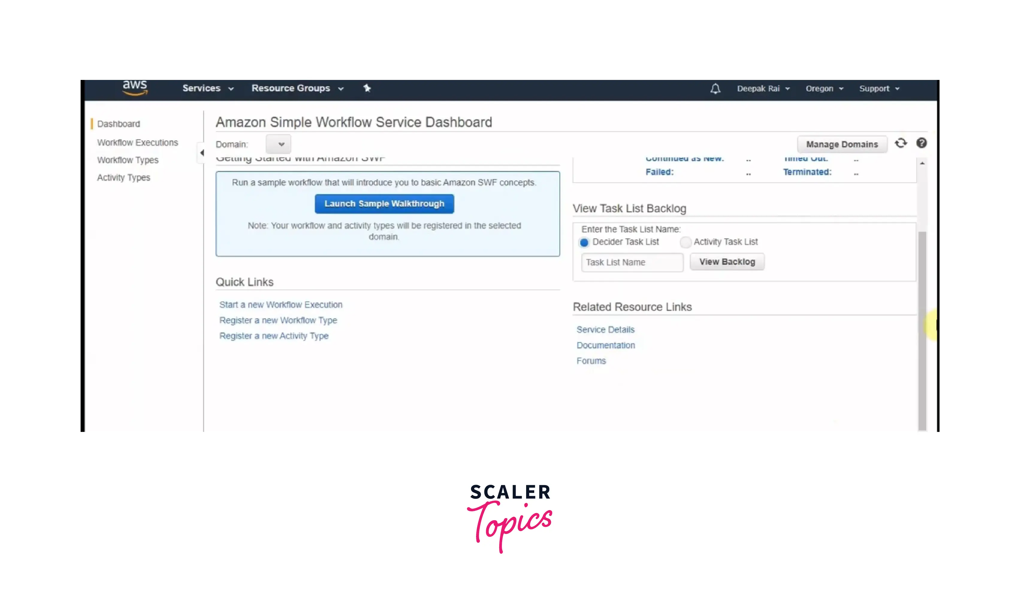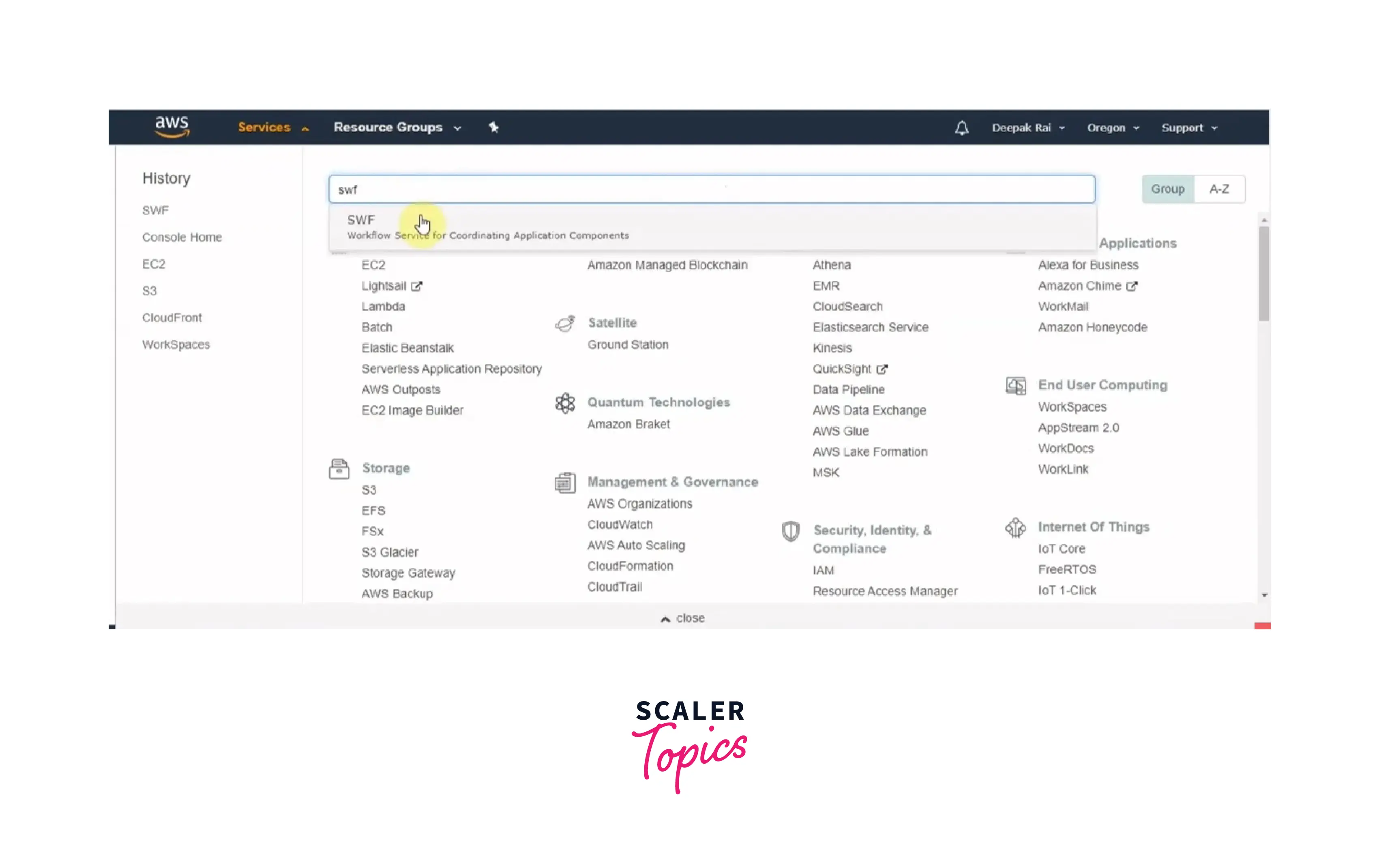 - First of all, login to your AWS account, and in the search tab, search for SWF. Then you will be moved to the AWS Simple Workflow Service Dashboard as shown below.