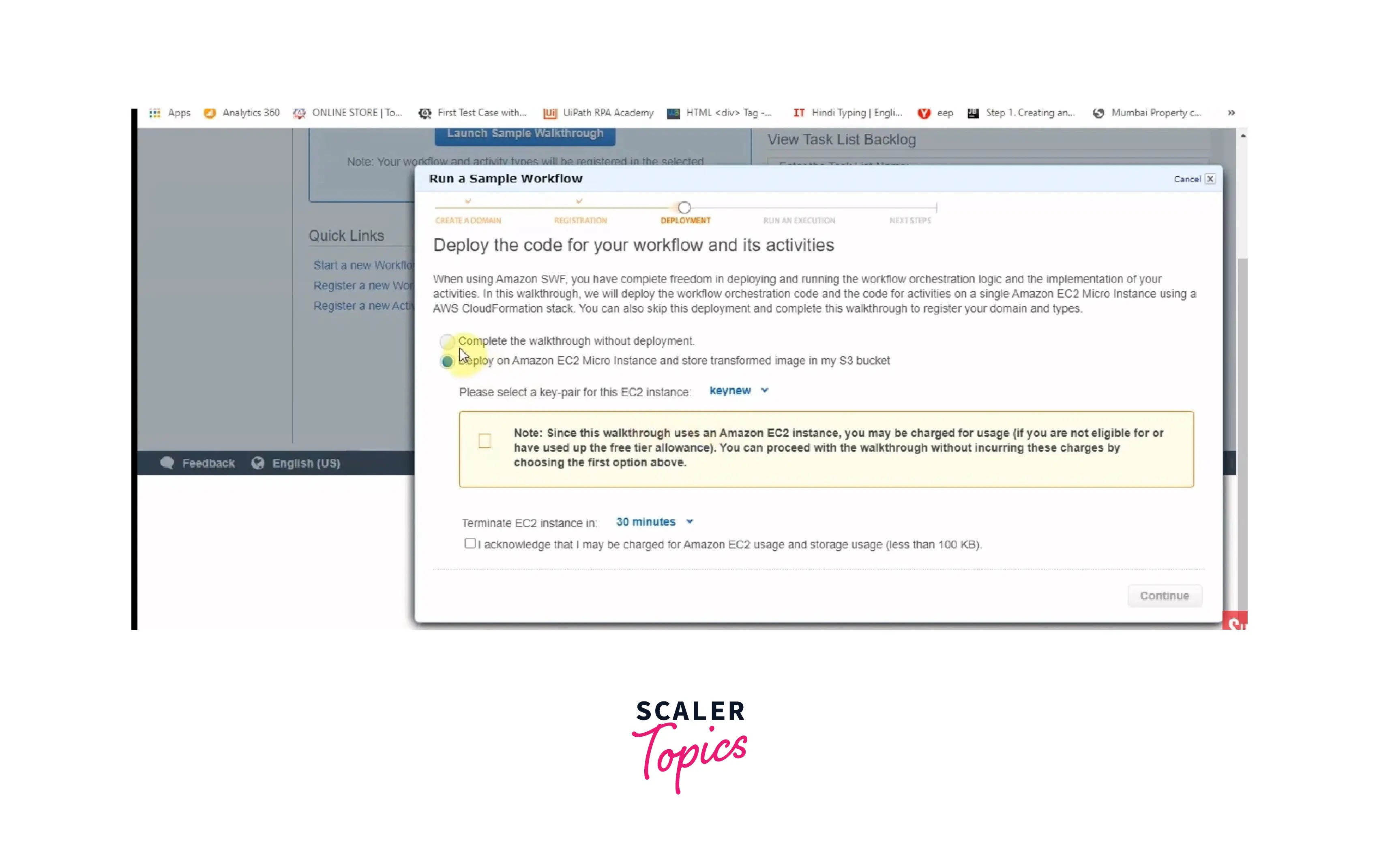 - Now you will get two options "Complete walkthrough without deployment" and "Deploy on Amazon EC2 micro instance". Once you enter all required information as shown below, click on the acknowledgment checkbox and Click on the "Continue" button.