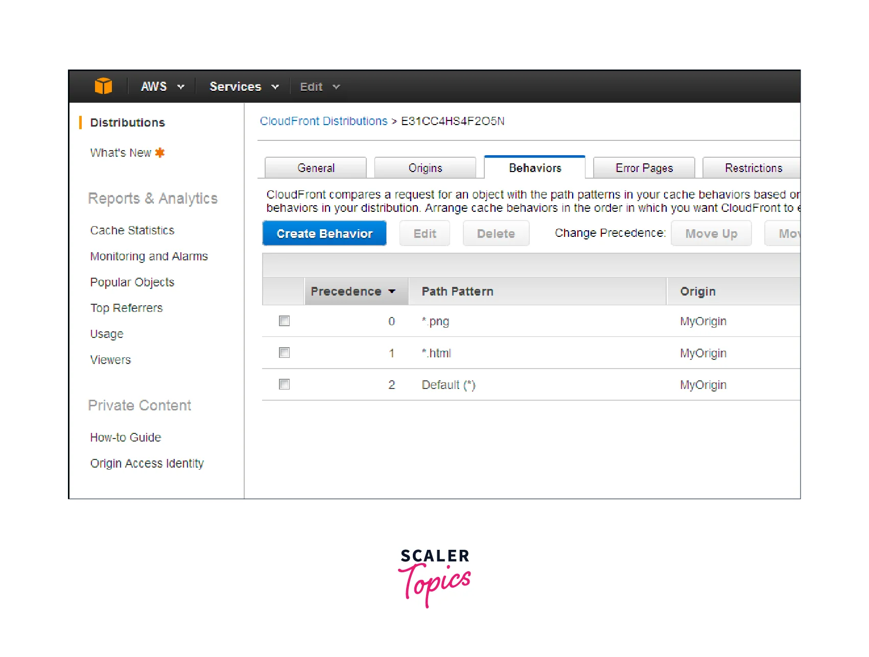 You can make all the configurations in behaviours. By the person making the request or the length of time an object will be stored in the cache, you can use it to enforce policies, alter or vary the sort of material given, or both. The default behaviour is always present in CloudFront Distributions, which have one too many Behaviours. Different behaviours in AWS can be set up in a hierarchy of precedence, and the default behaviour in AWS will be used if none of the conditions are met.