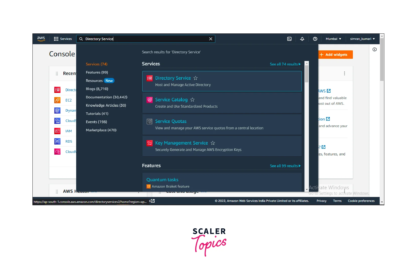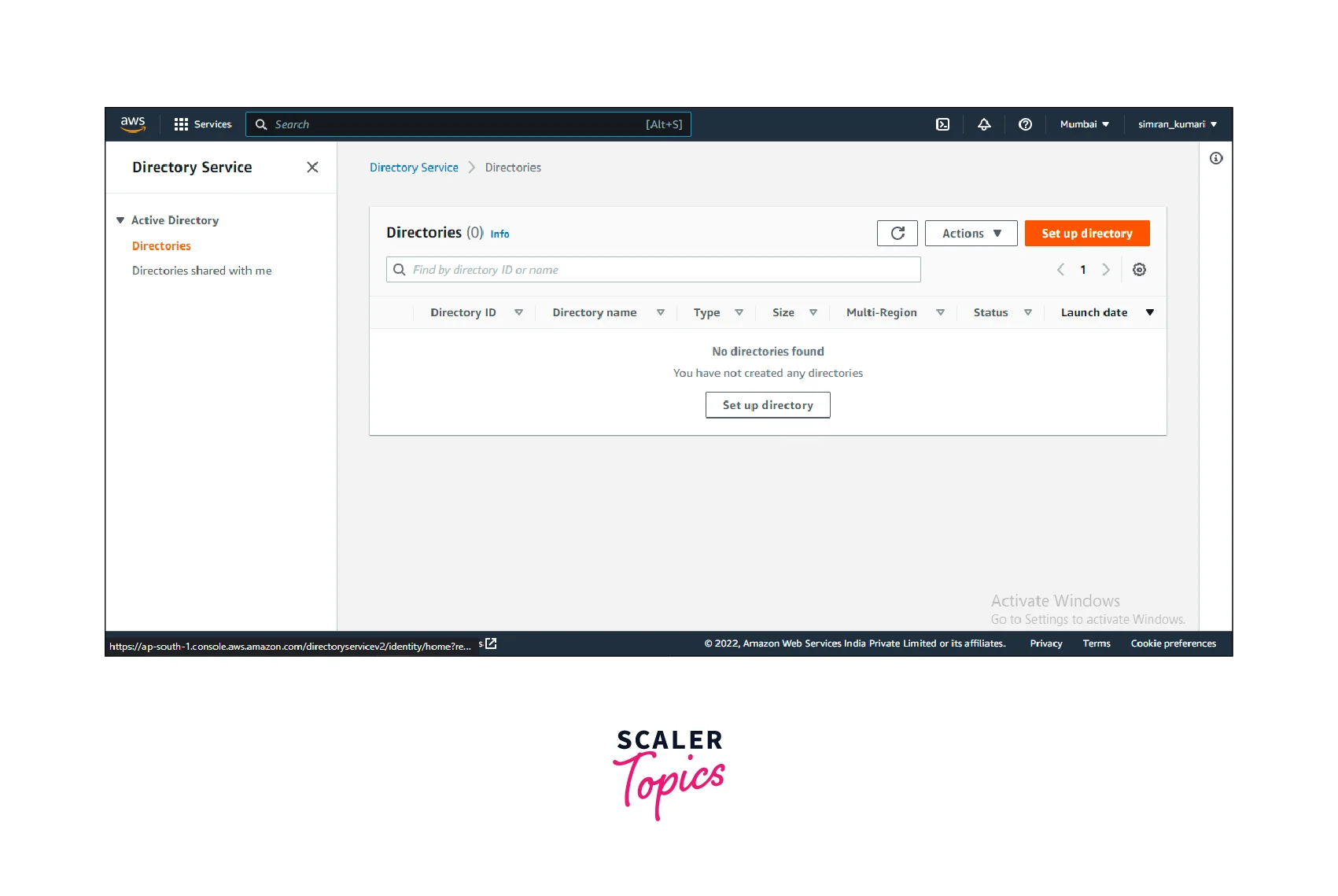 - Login to the AWS console. Search Directory Service in the search bar and click on it.