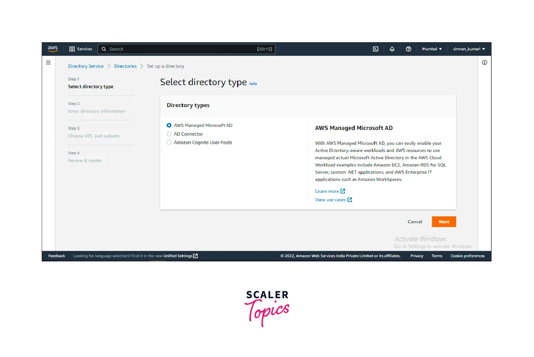 - On the next screen, we must choose the directory type from the options. Here, in this case, we will choose AWS Managed Microsoft AD and click on Next.