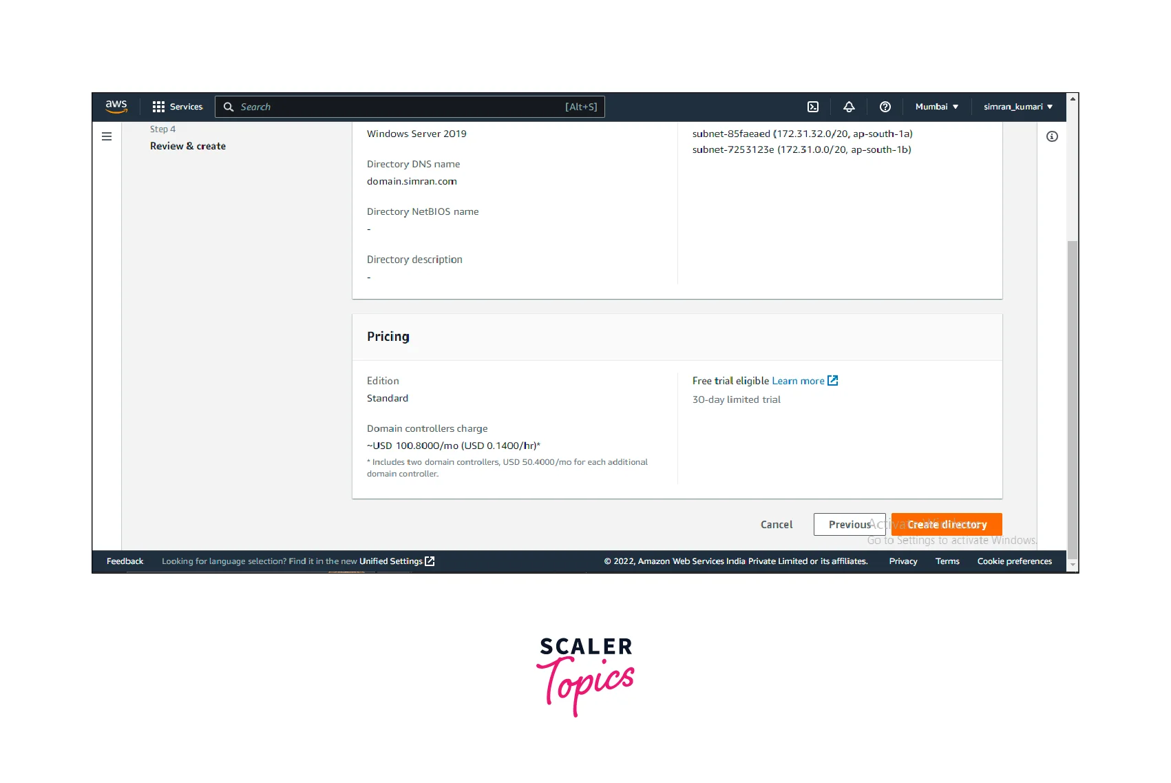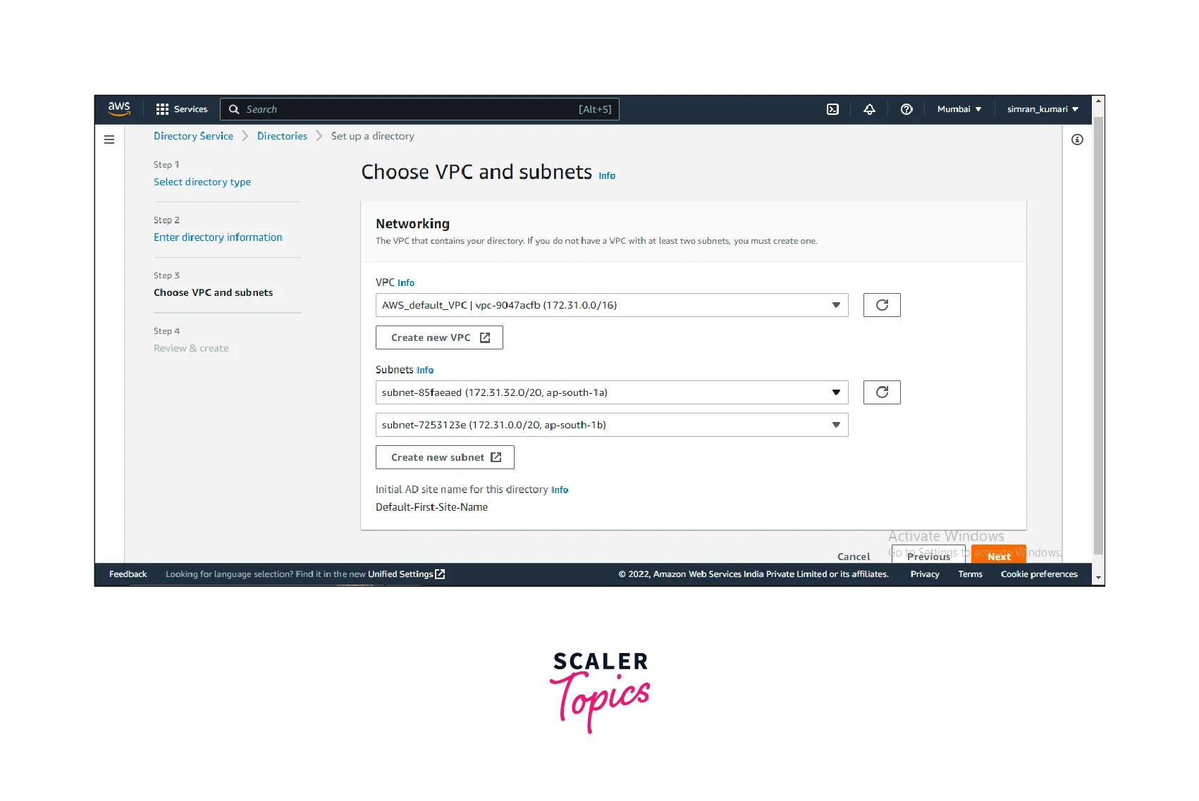 - On the next configuration page, we have to choose VPC and subnets for this directory. Click on Next.