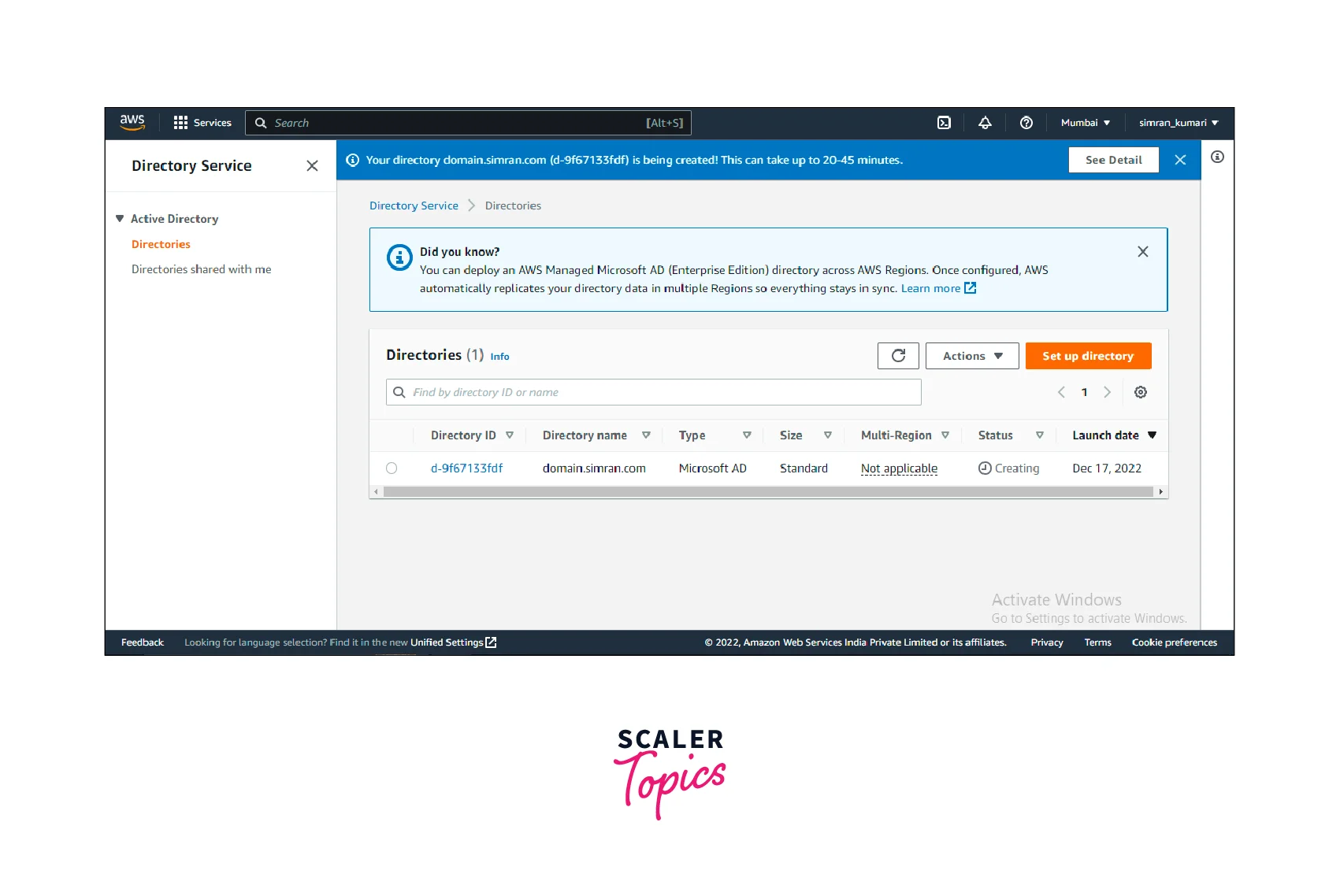 - It will start creating the directory. It will take 20 to 40 minutes to create it. After creating, it will show Available as the status. Click on the directory ID to learn about the details of this directory.