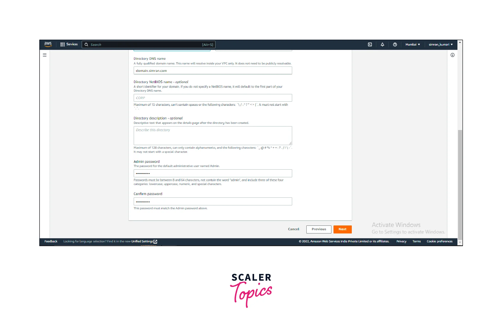 - Scroll down and provide a directory DNS name. Set the Admin password and click on Next.