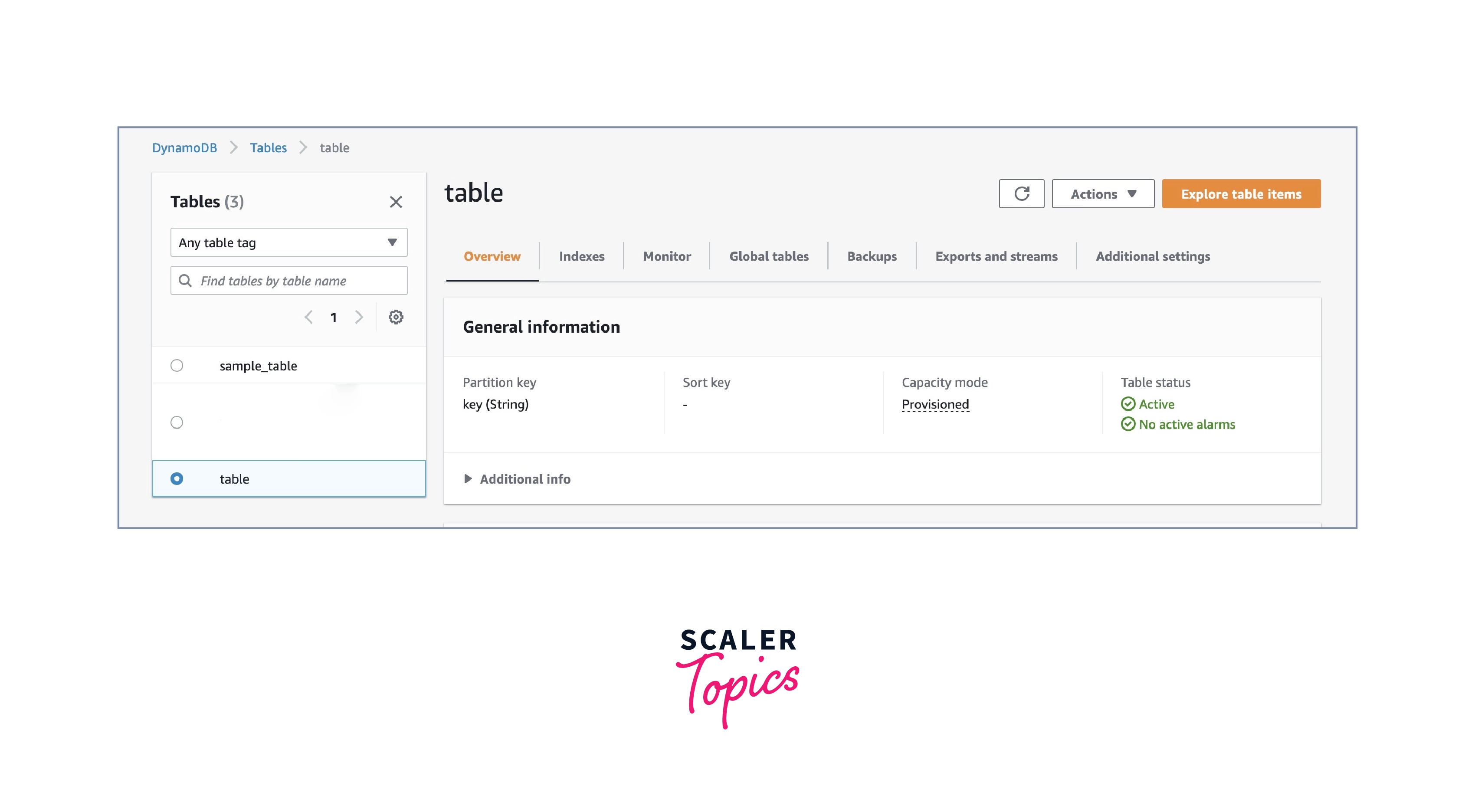 - Provide a Tablename and a Partition key. Note that the partition key is a part of the table's primary key.