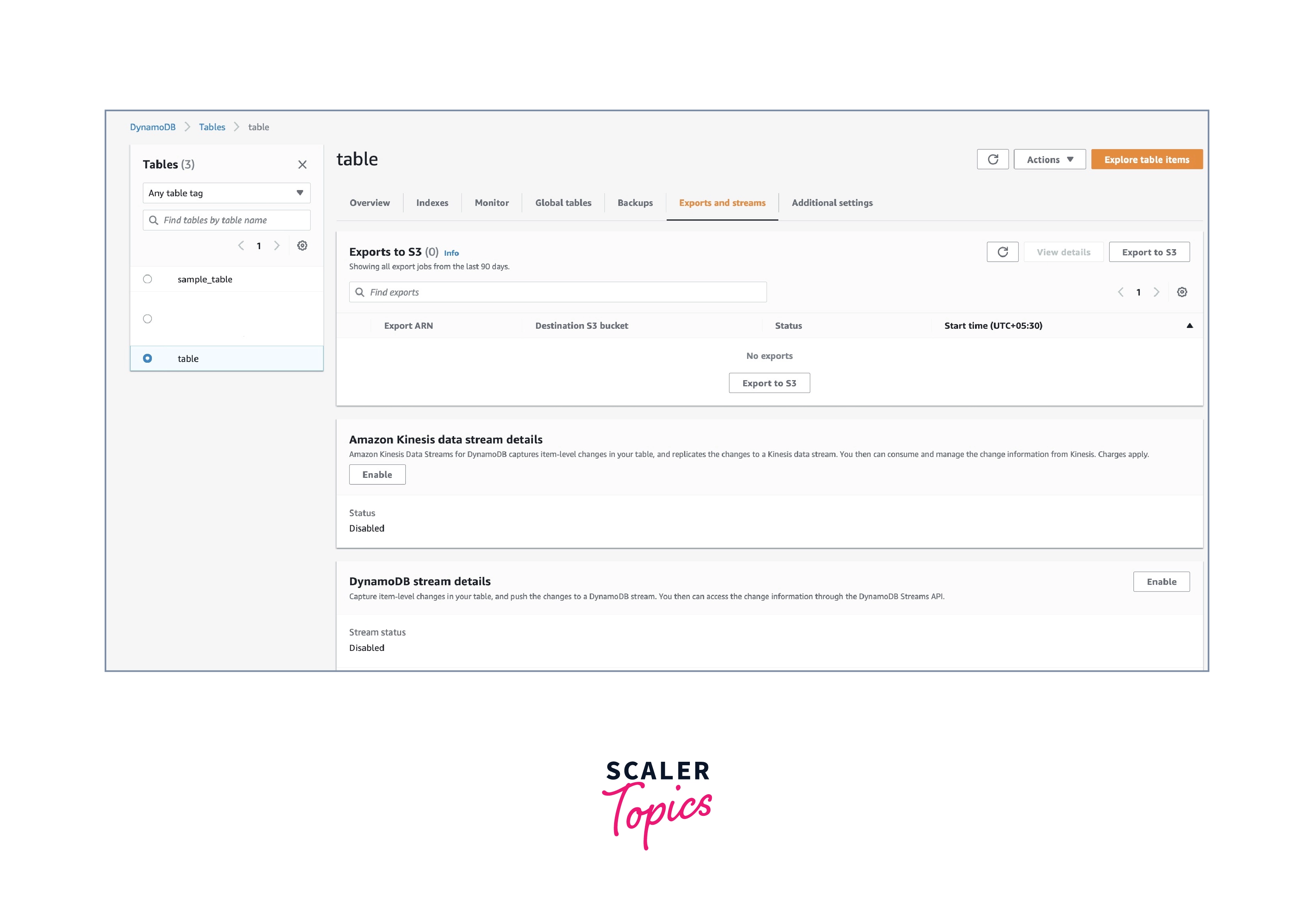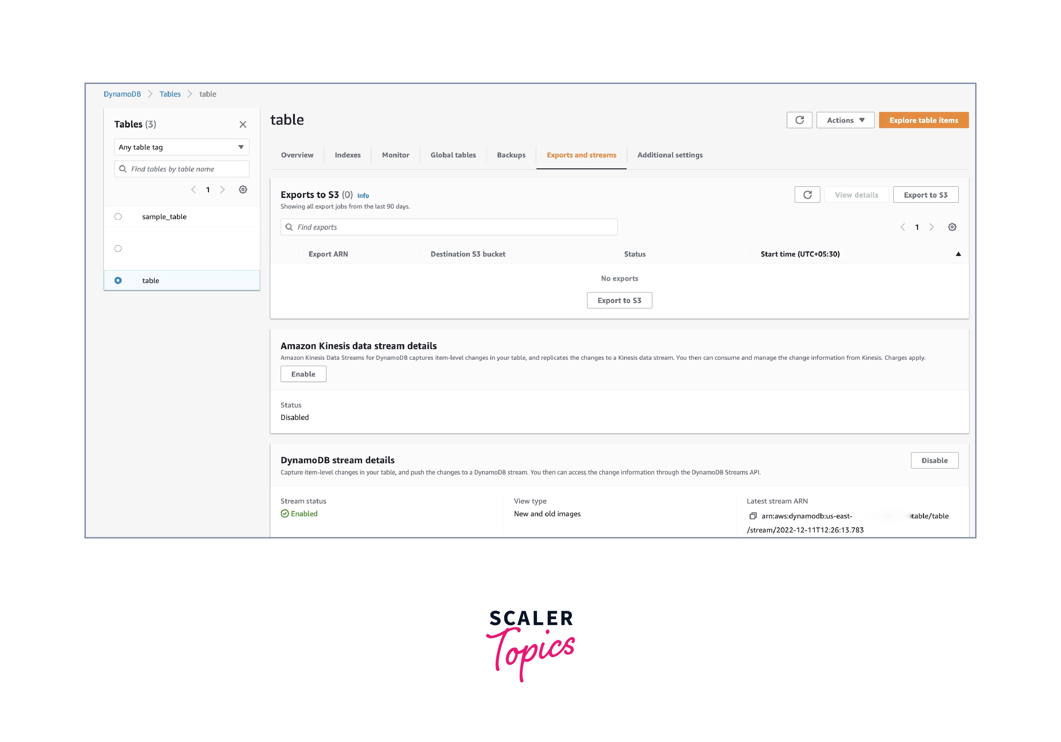 - When you navigate to the 'Export and streams' option, you will observe that the DynamoDB stream is disabled.