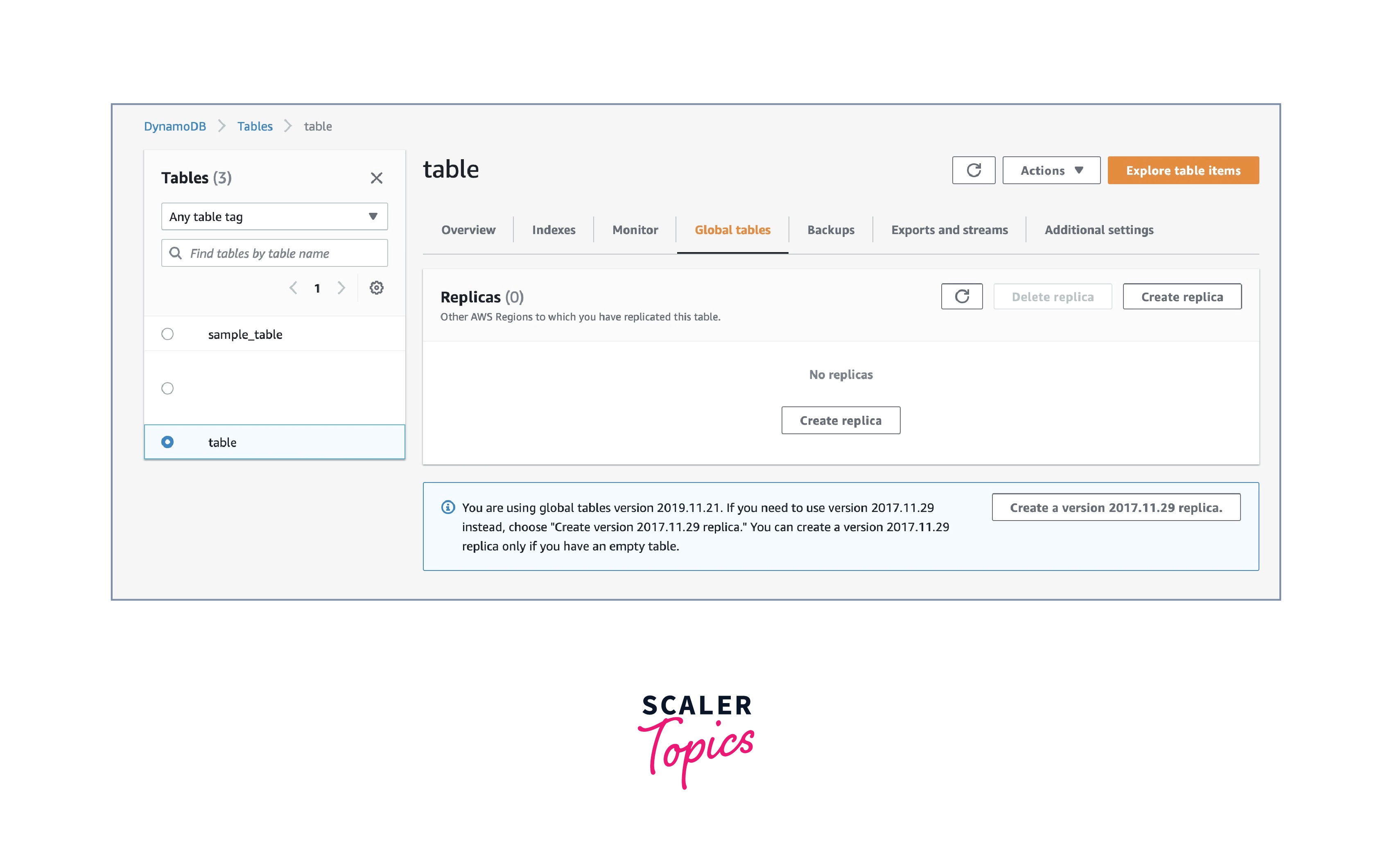- Move to the 'Global tables' option and choose 'Create replica.'