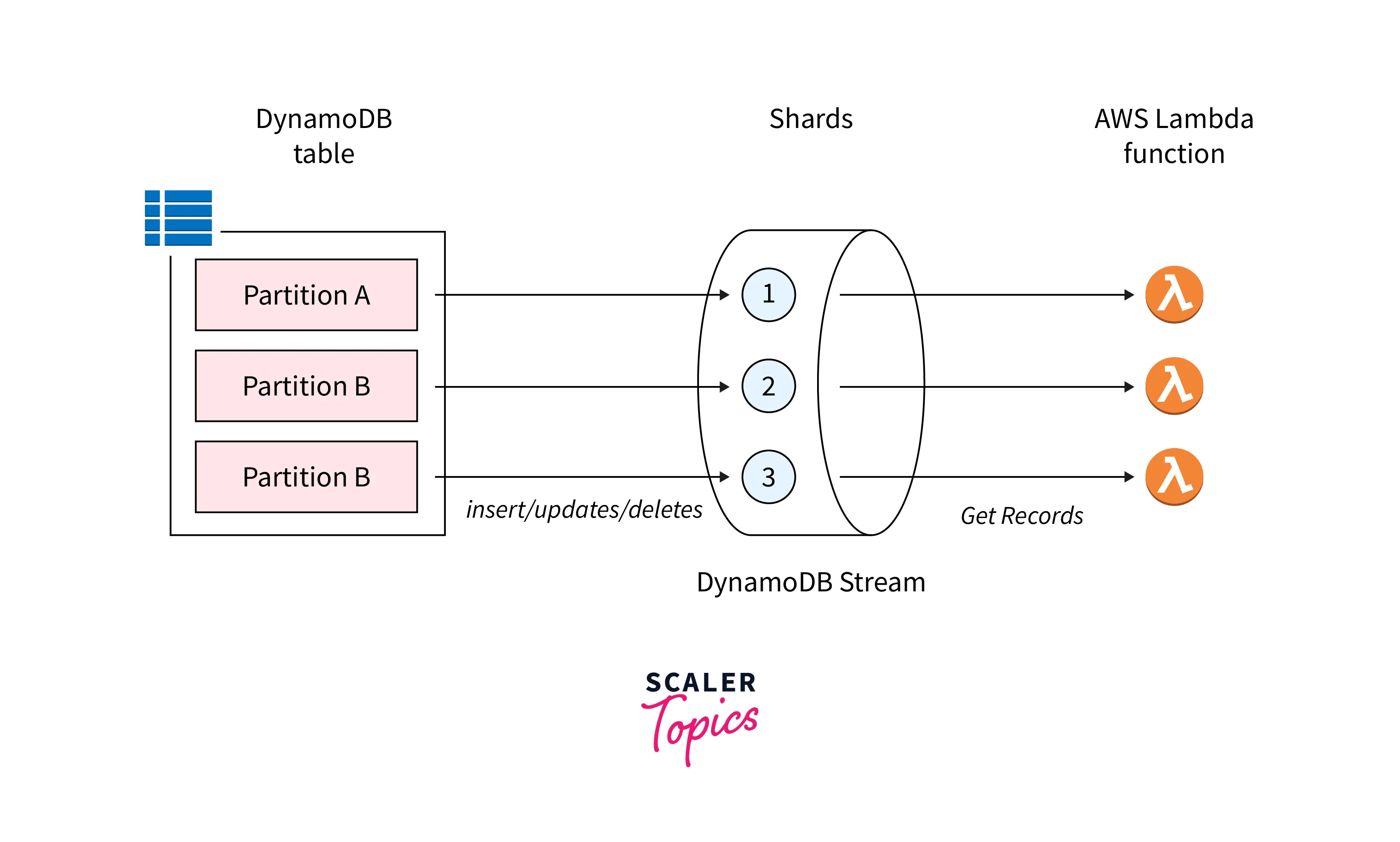 - Each DynamoDB table partition is allocated at least one DynamoDB Stream shard. A shard contains the modification events or records.
