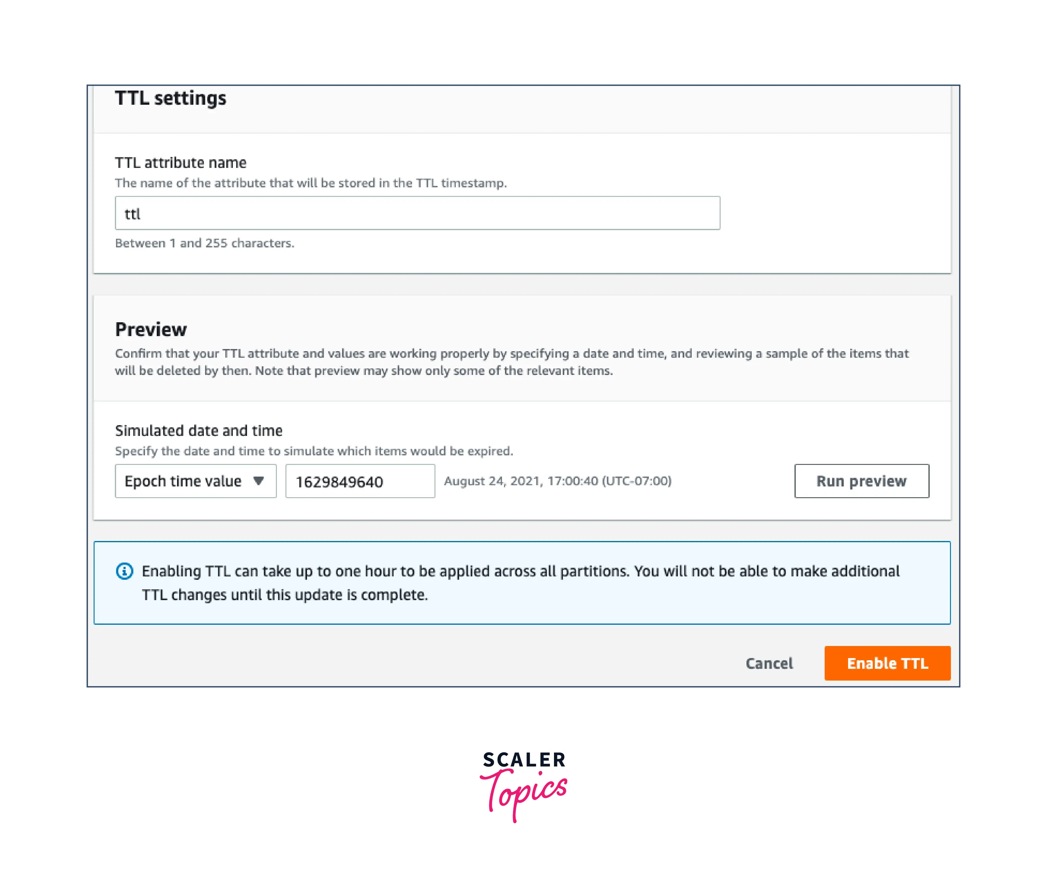 - Put the TTL attribute name on the Enable Time to Live (TTL) page.