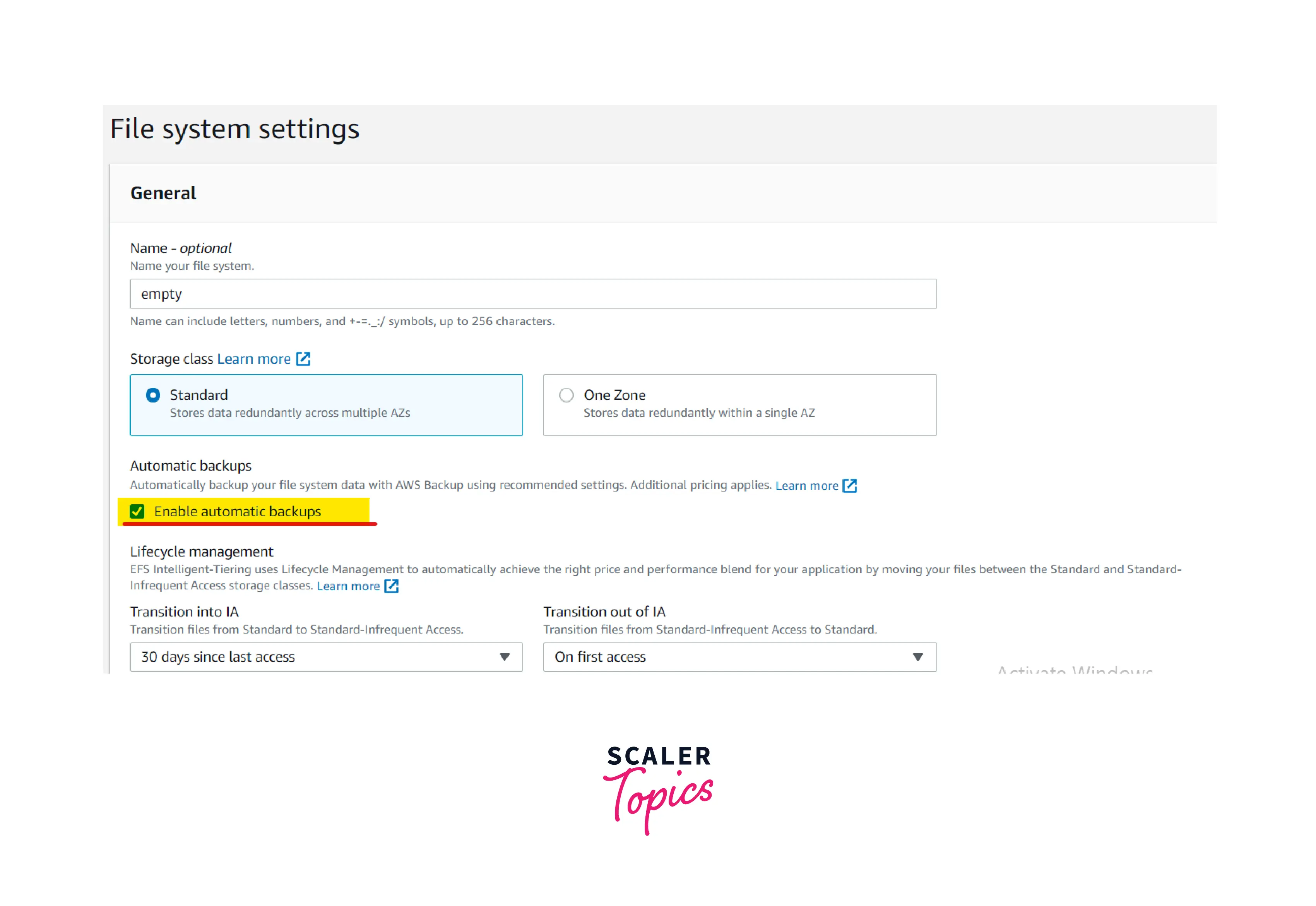 Amazon Backup is a service that can be used to automate the backup process for all the compute resources such as EC2, RDS, EFS, DynamoDB, etc. using Amazon Backup, we can automatically enable EFS backup and put retention policies on a centrally configured Amazon Backup dashboard. we also have the option to enable automatic backup while creating EFS in the console.