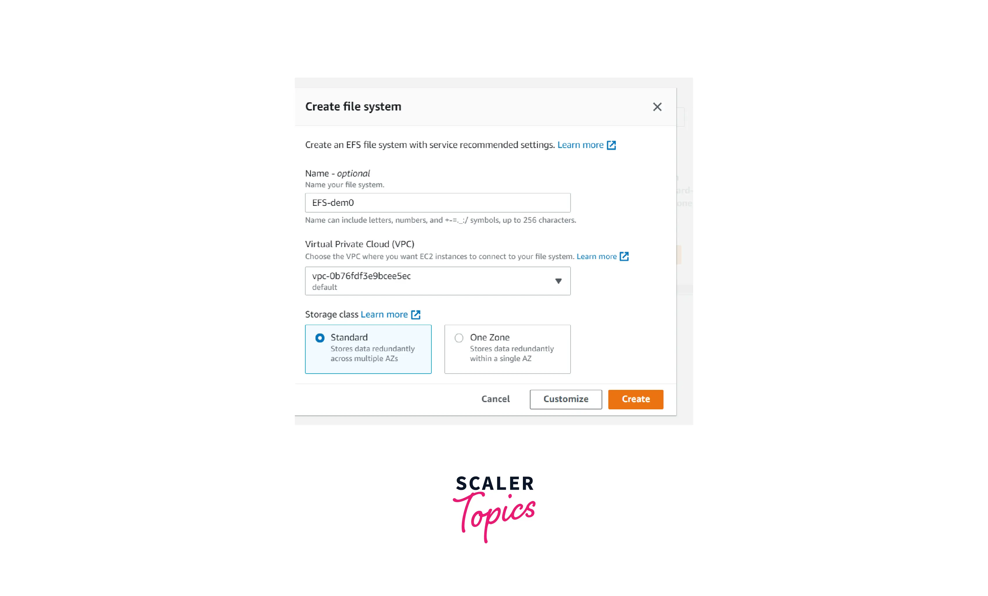 Name: EFS-Demo VPC: Select your VPC Storage Class: Standard