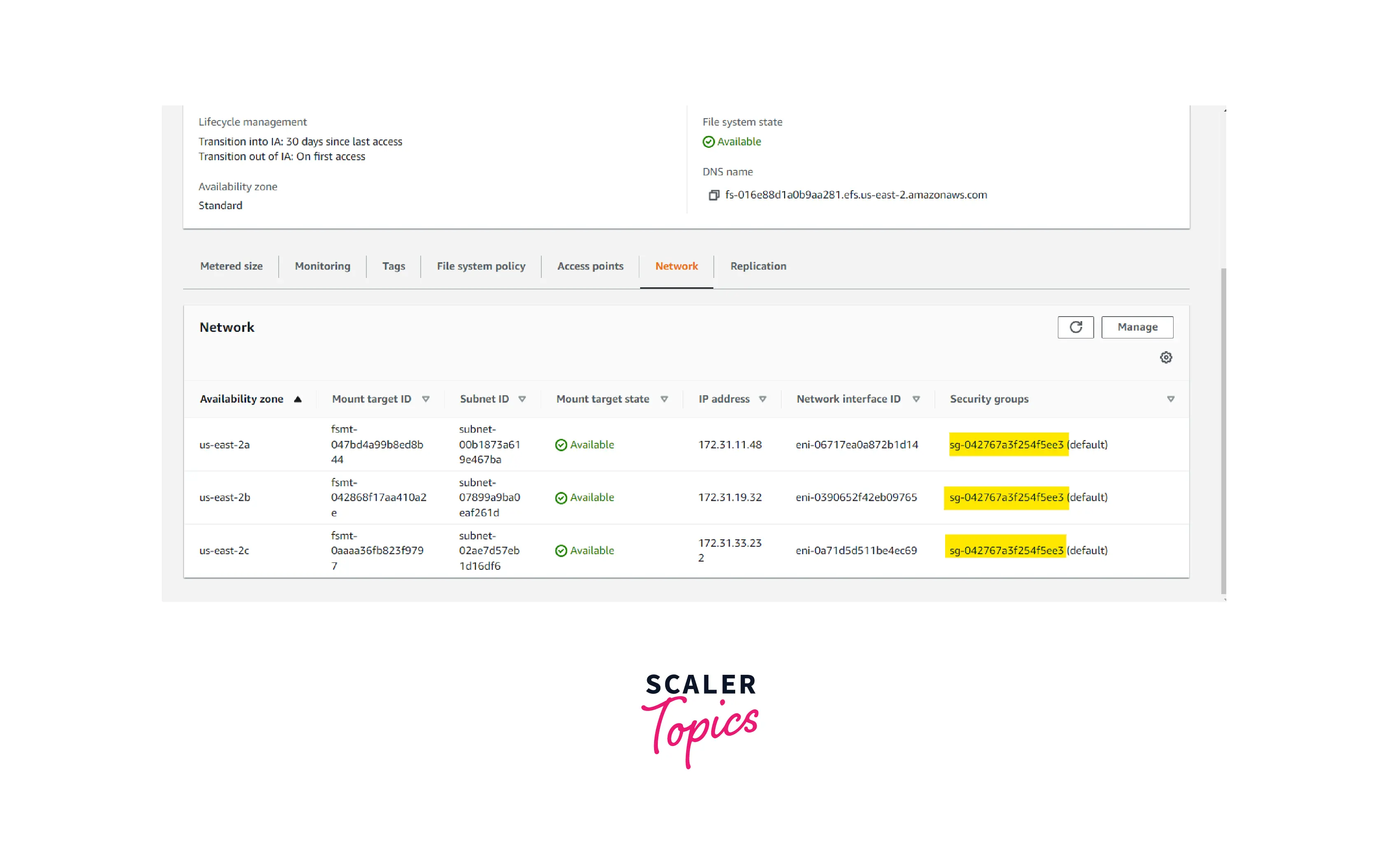 - Once EFS is created, click EFS ID and go to the network tab.In the network tab, select the efs security group and open the security group in another tab.