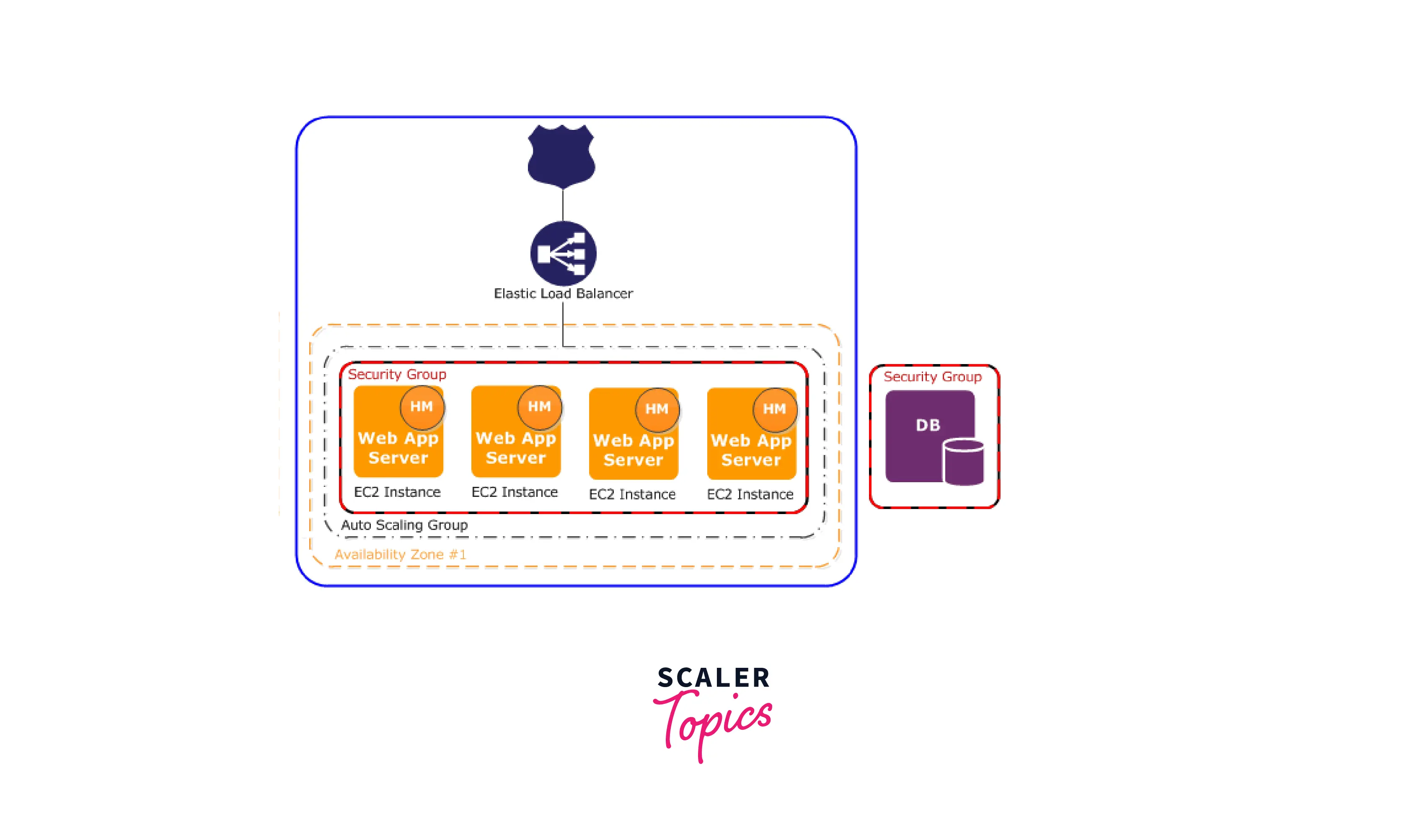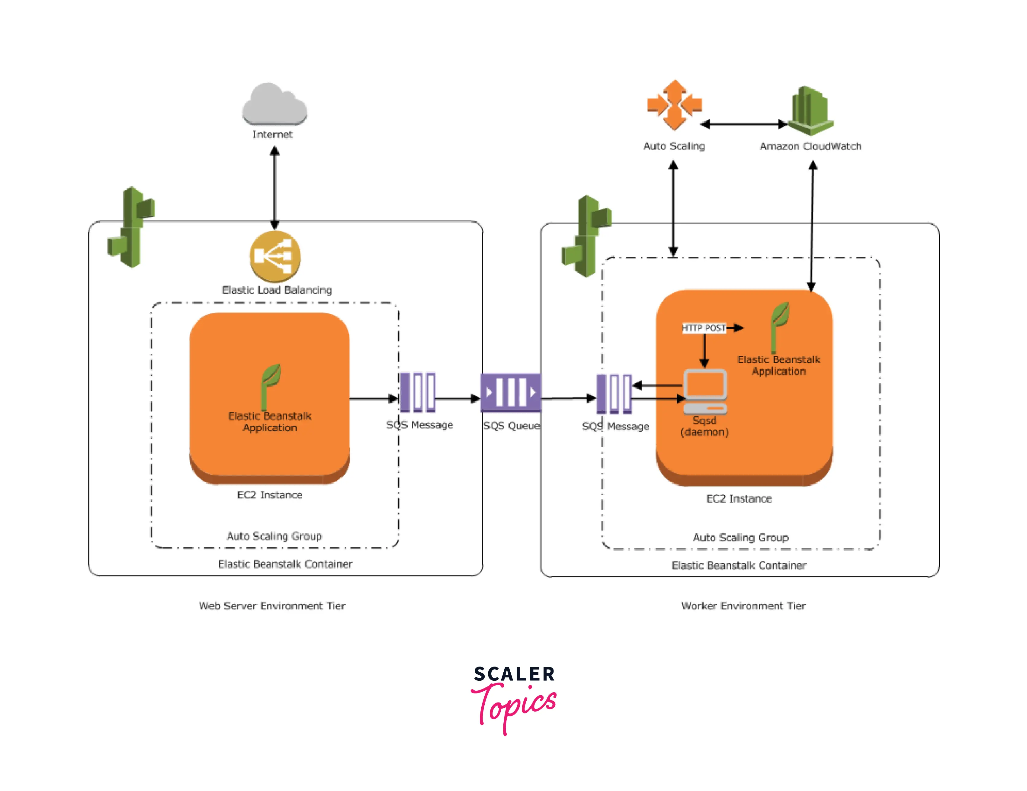 The figure shows an example of Elastic Beanstalk architecture for a web server environment layer and how the components in that environment tier interact.