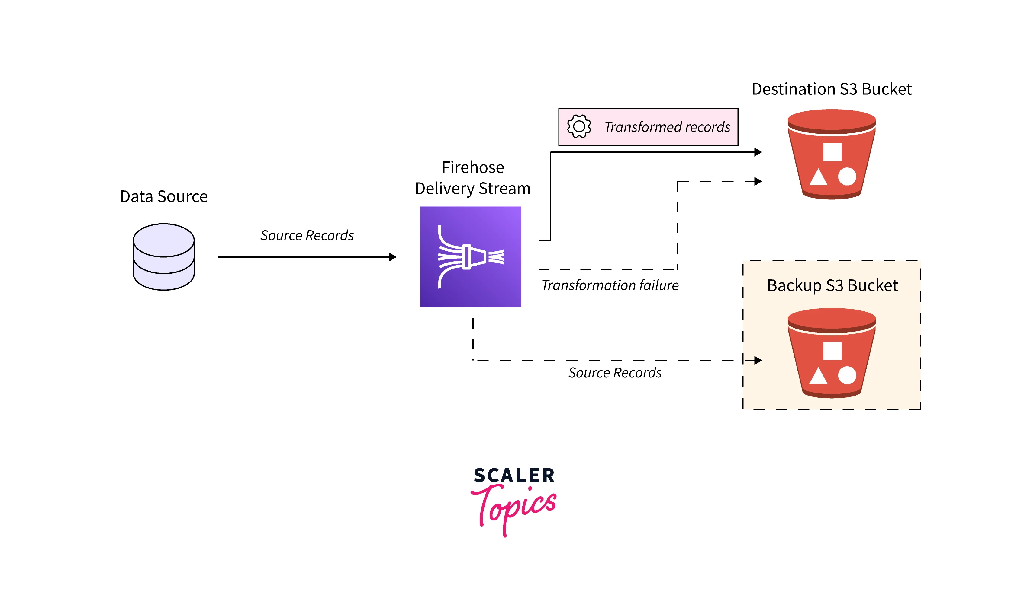 For Amazon S3 destinations, streaming data is delivered to your S3 bucket. You can back up source data to another Amazon S3 bucket if data transformation is enabled.