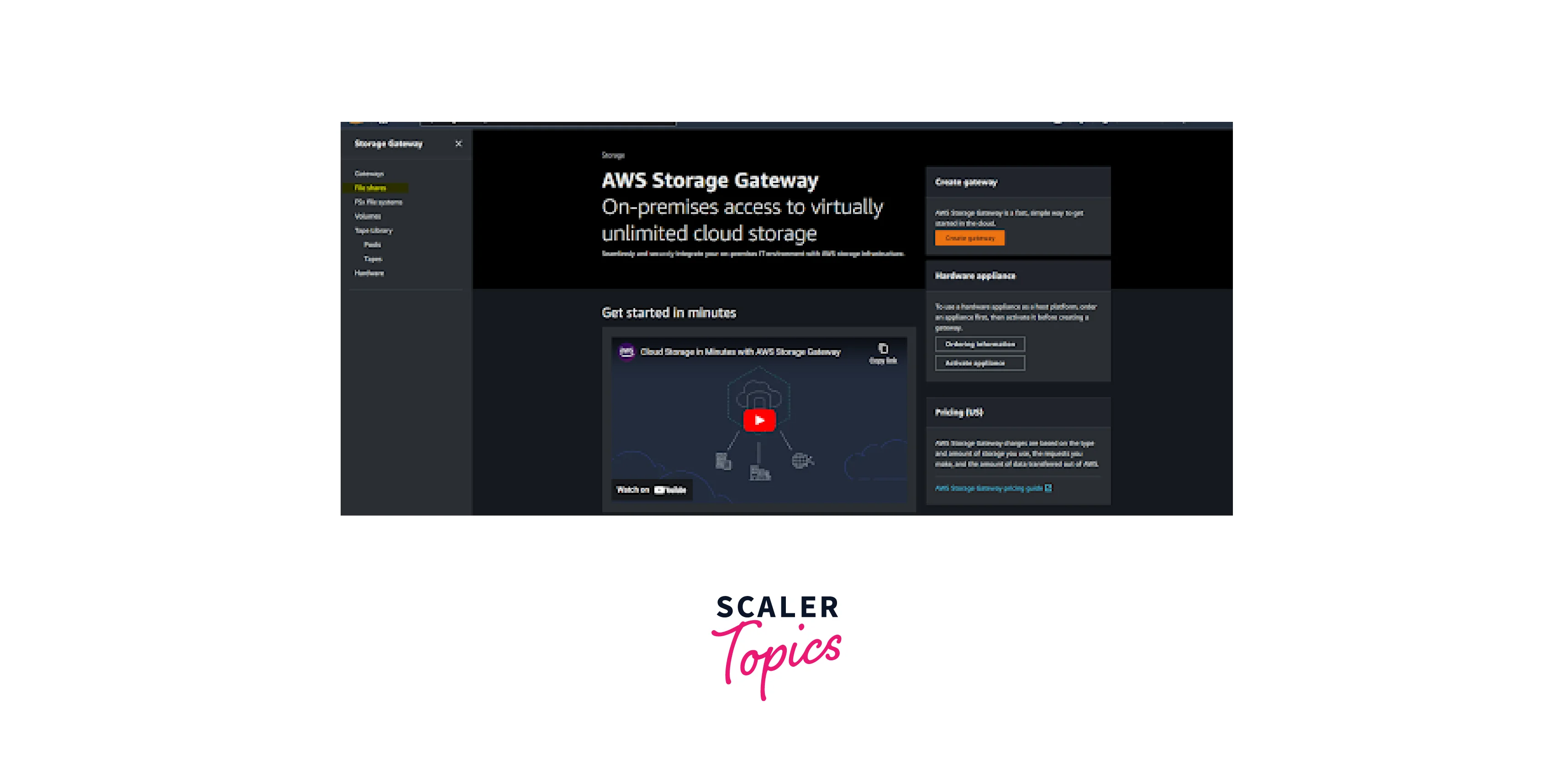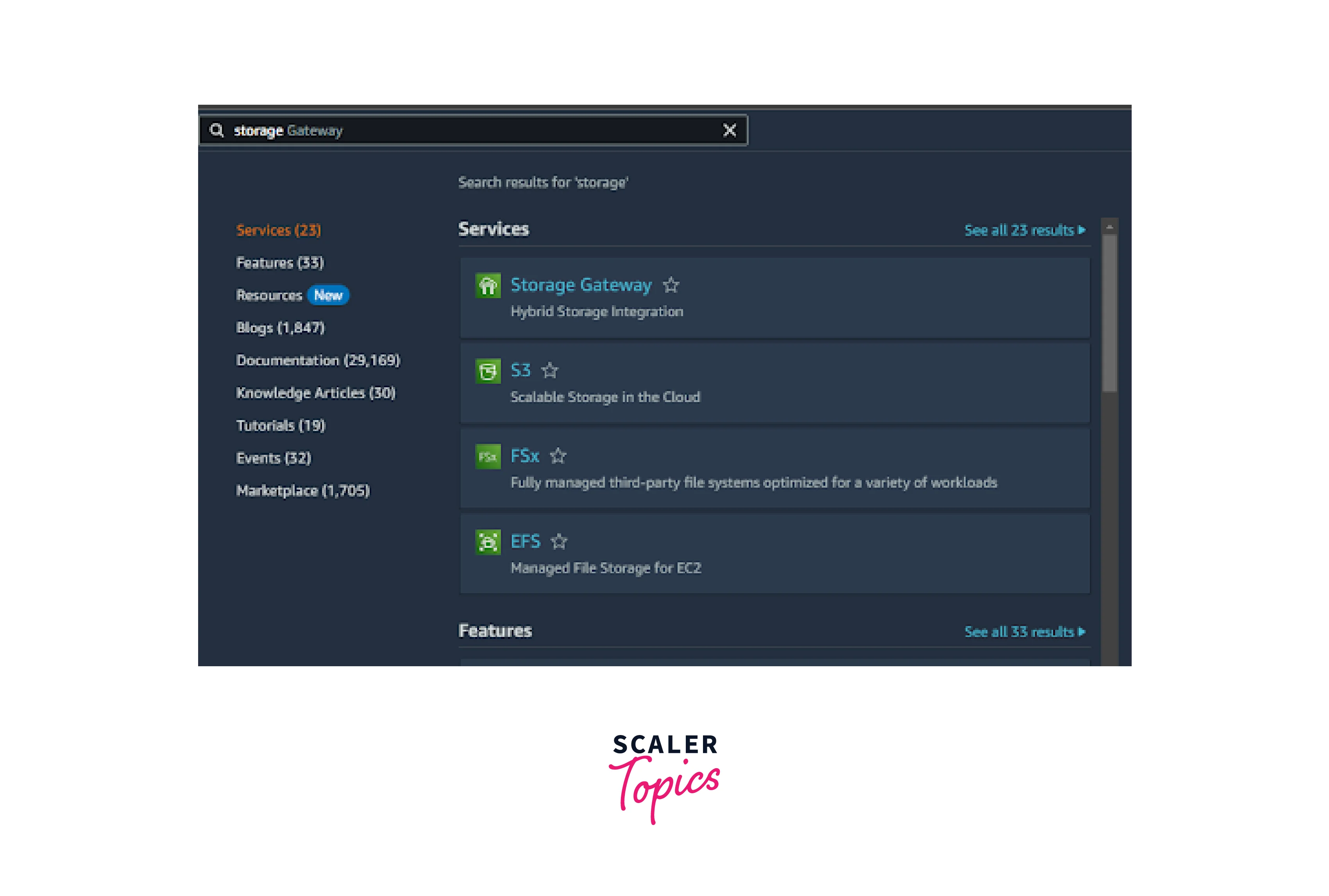 Step 1: Log in to the AWS management console, enter "storage gateway" in the search bar, and select Storage Gateway from the drop-down menu.