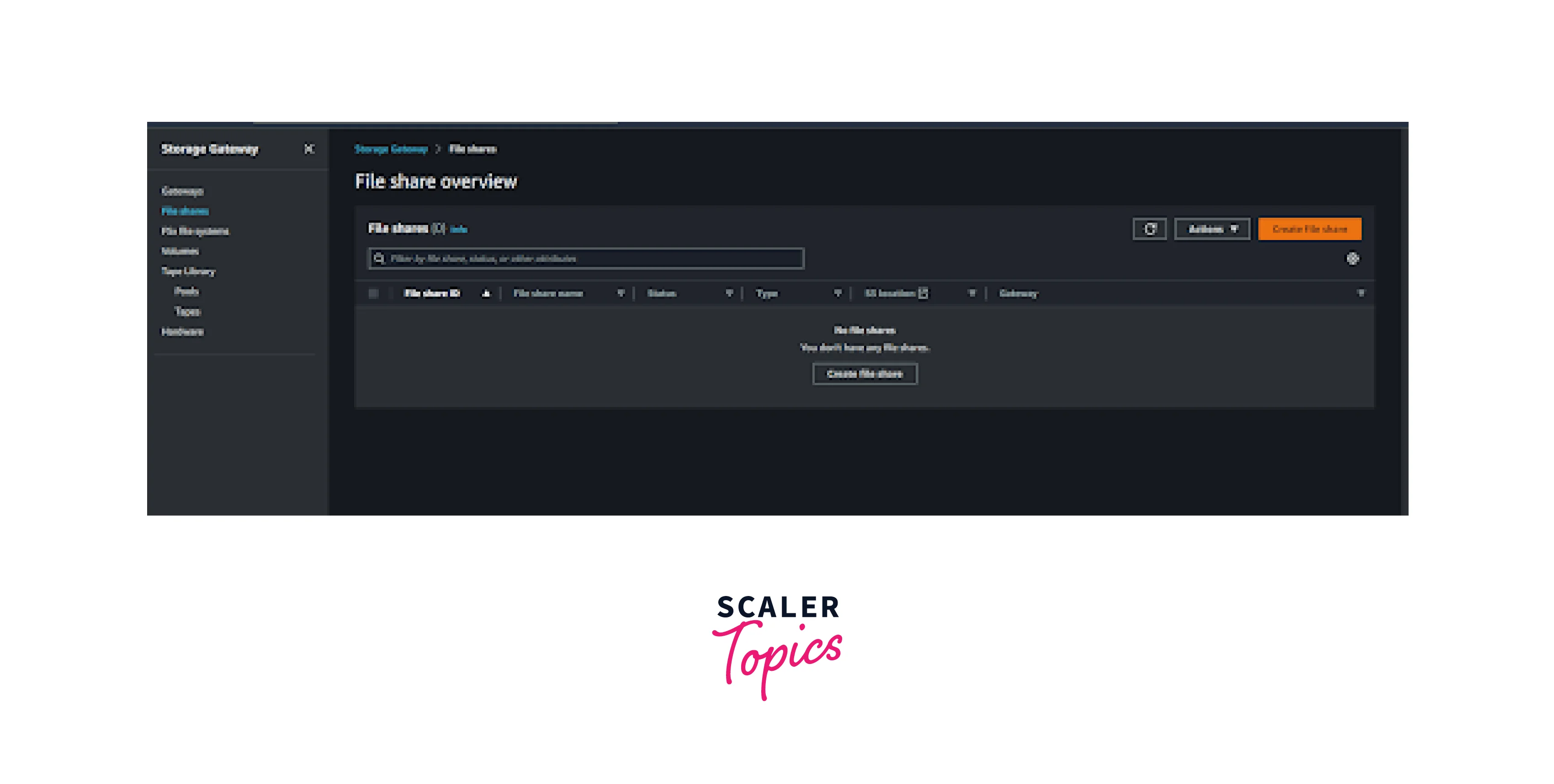 Step 2: In the AWS Storage Gateway console, select the file share option displayed in the left navigation panel as shown in the below image.