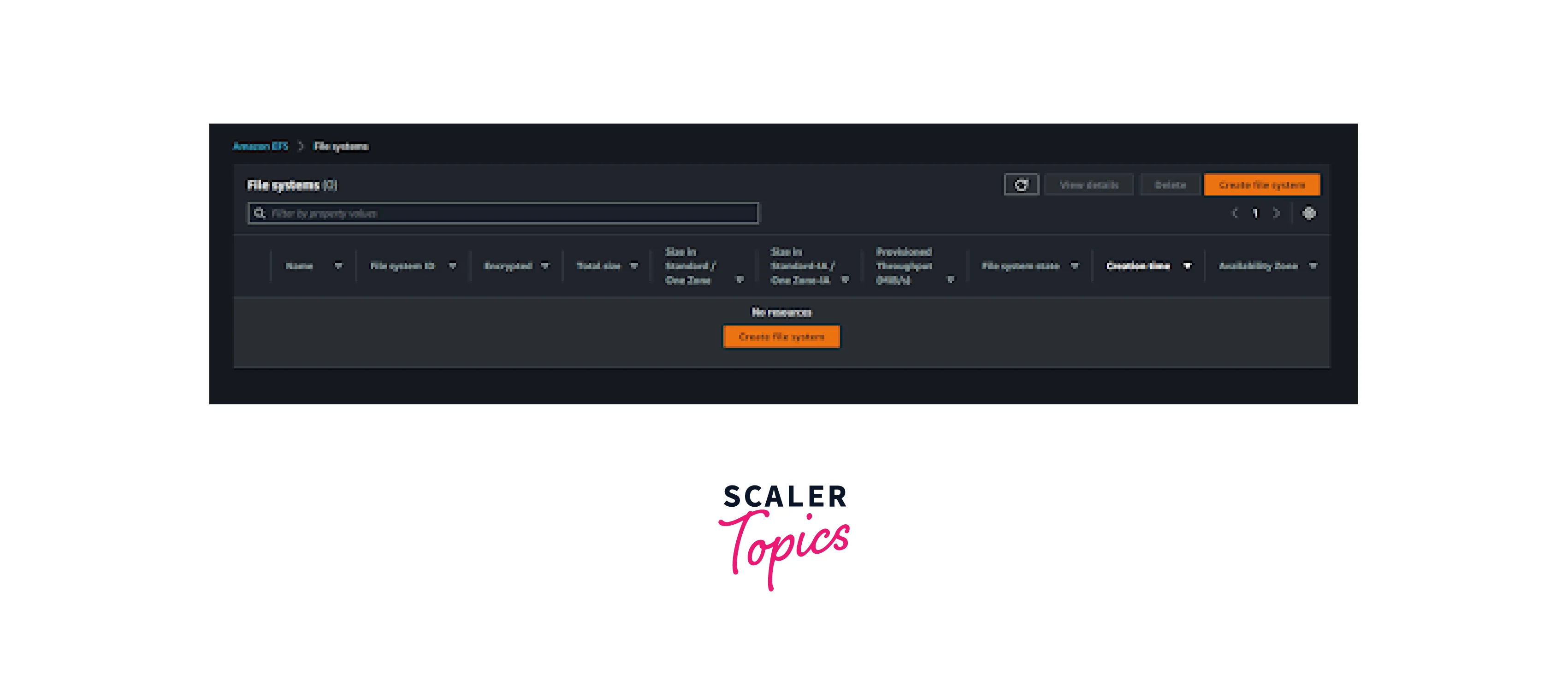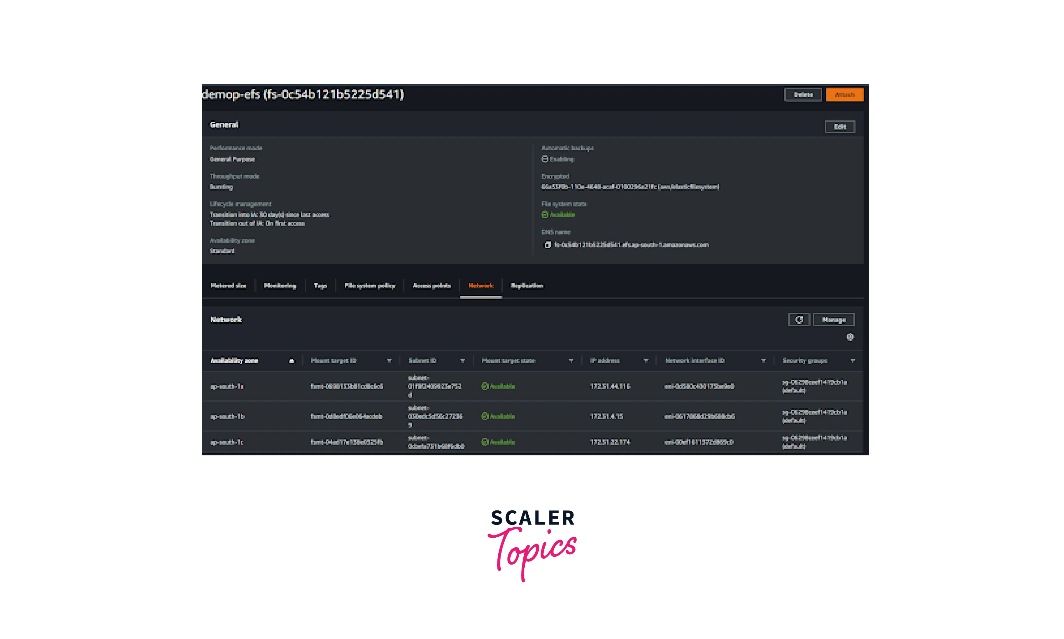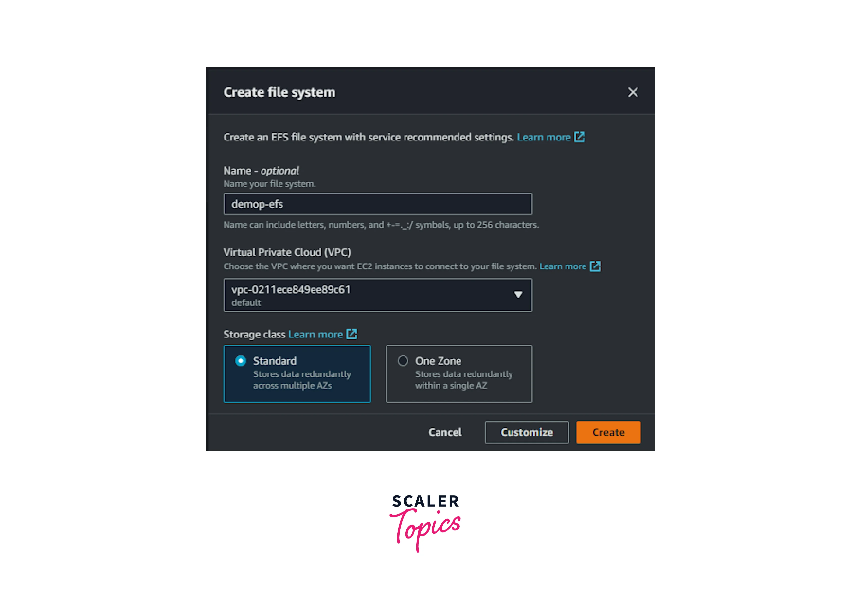 Note: EFS has Standard and One Zone access modes. Standard mode provisions the EFS in three availability zones, whereas one zone mode provisions the EFS in one availability zone.