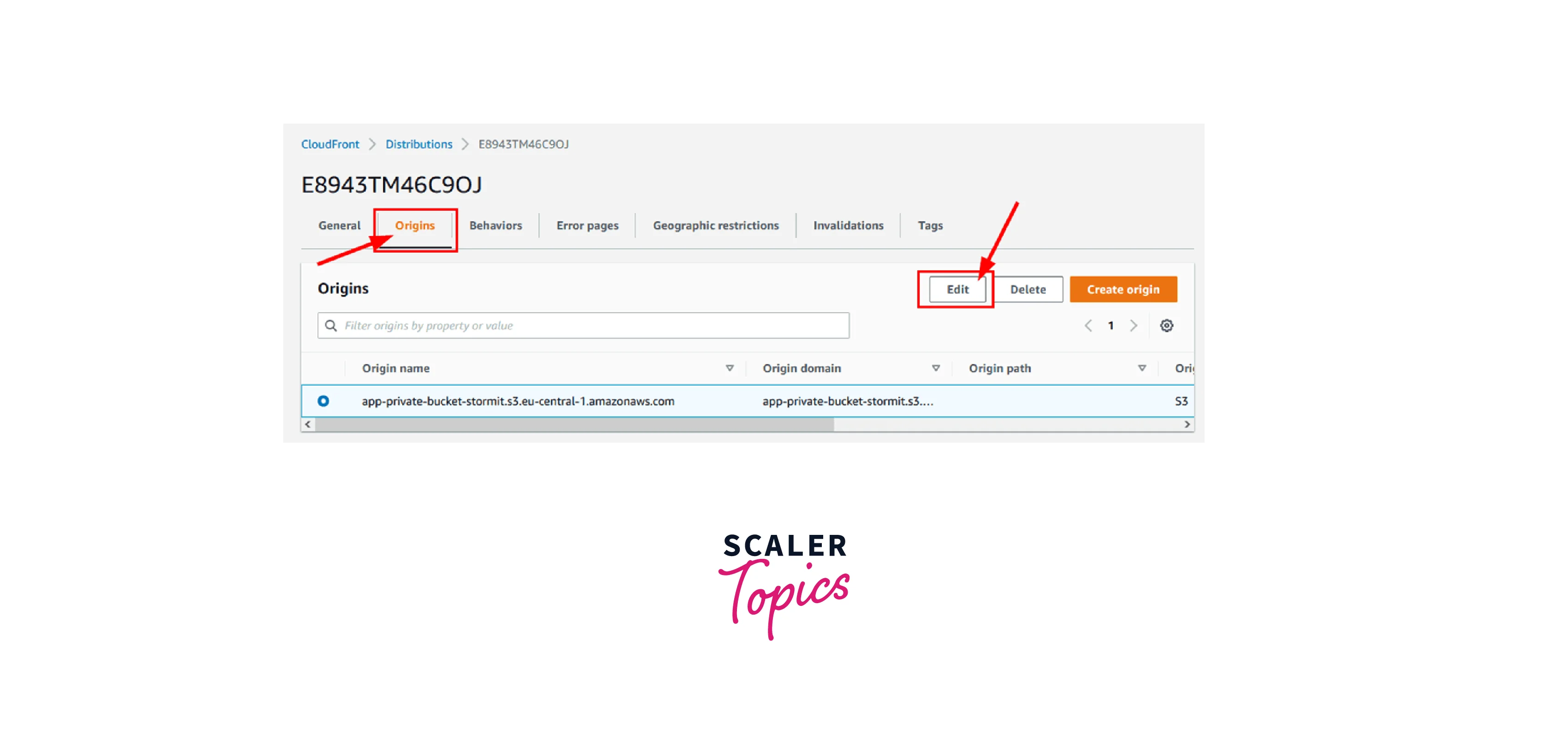 - Click on the Origins tab. Then choose Edit after selecting the Amazon S3 origin.