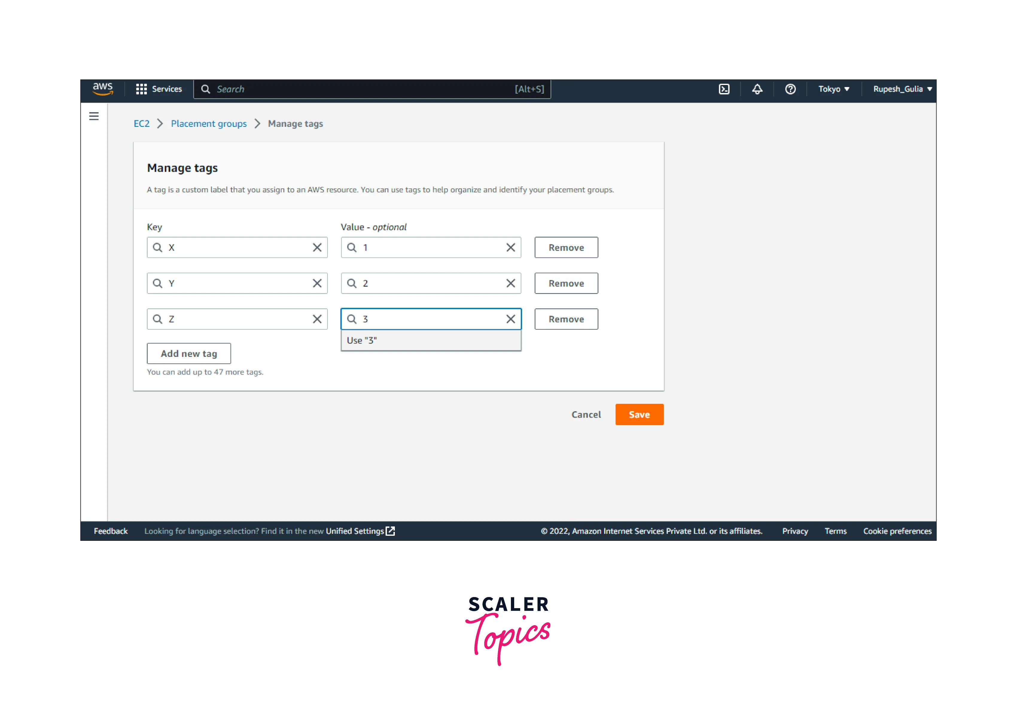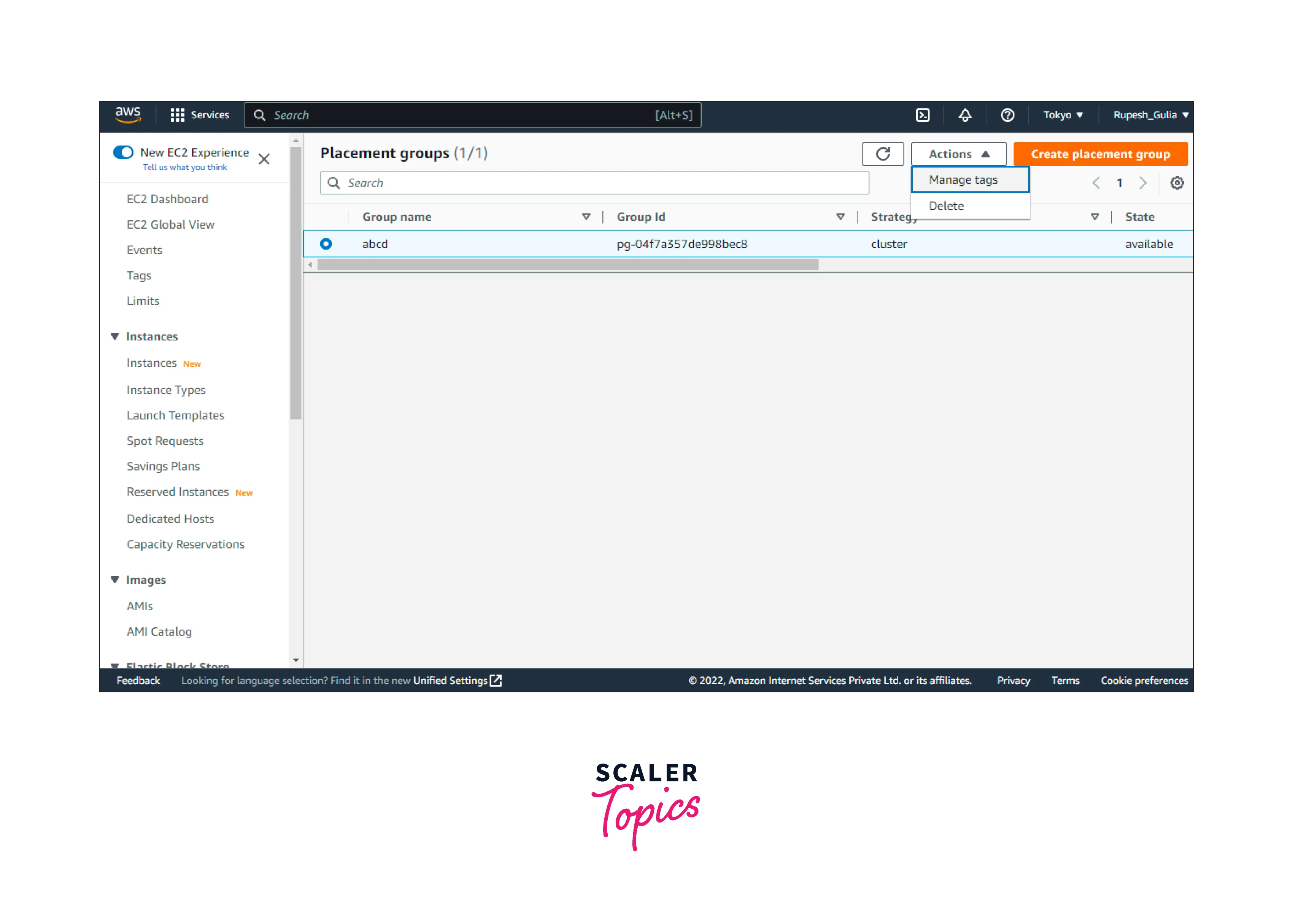 - The tags added to a placement group are displayed on the Manage tags page. For adding or deleting the tag, just follow these steps:
