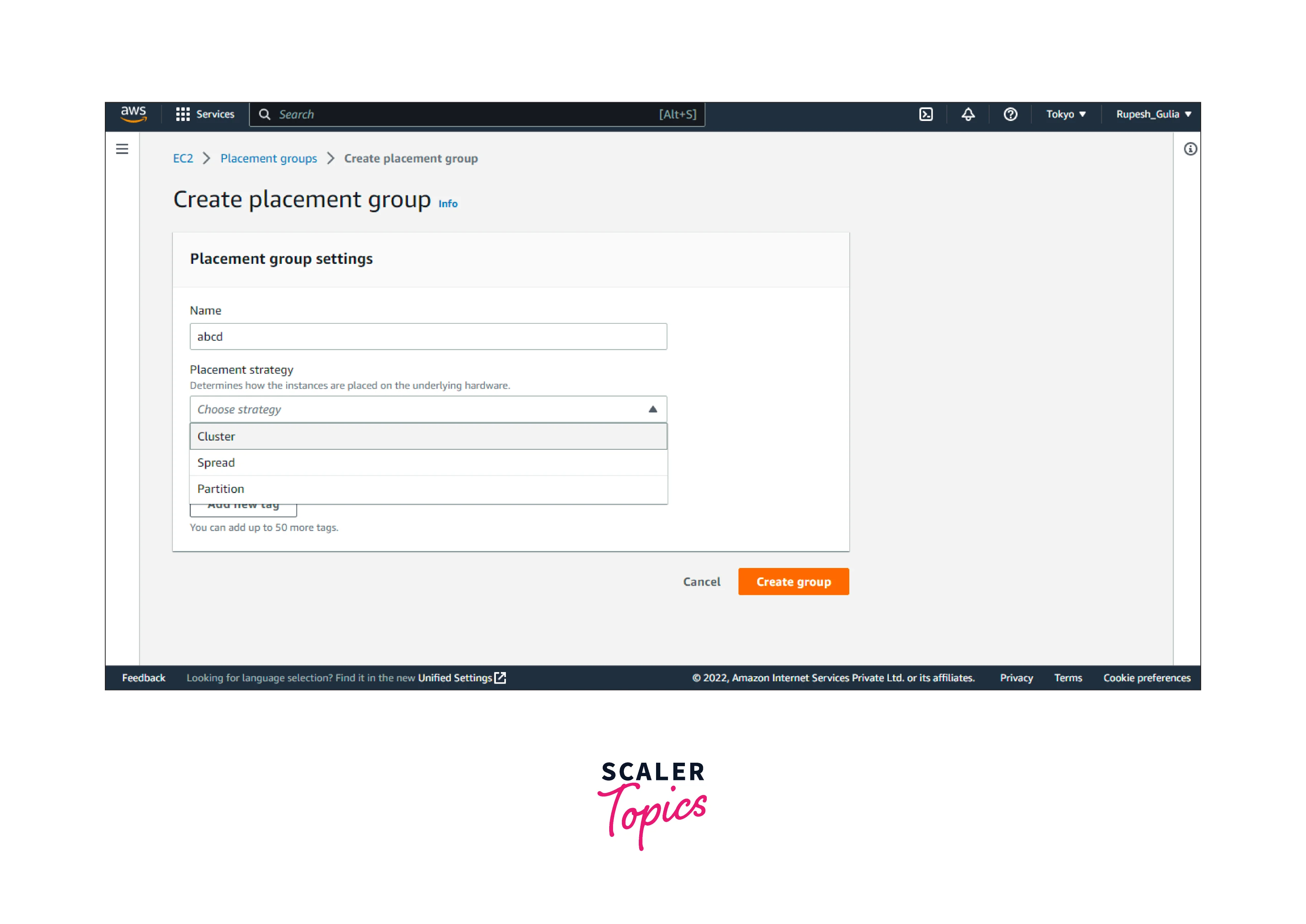 When you create a new EC2 instance, the AWS EC2 service tries to distribute the instance so that each of the instances is distributed among hardware resources to prevent related failure. To suit the demands of the workloads, users may utilize placement groups in AWS to impact the allocation of a collection of interconnected instances. Forming a placement group is completely free. Users may construct a placement group utilizing these placement techniques, based on the workload: