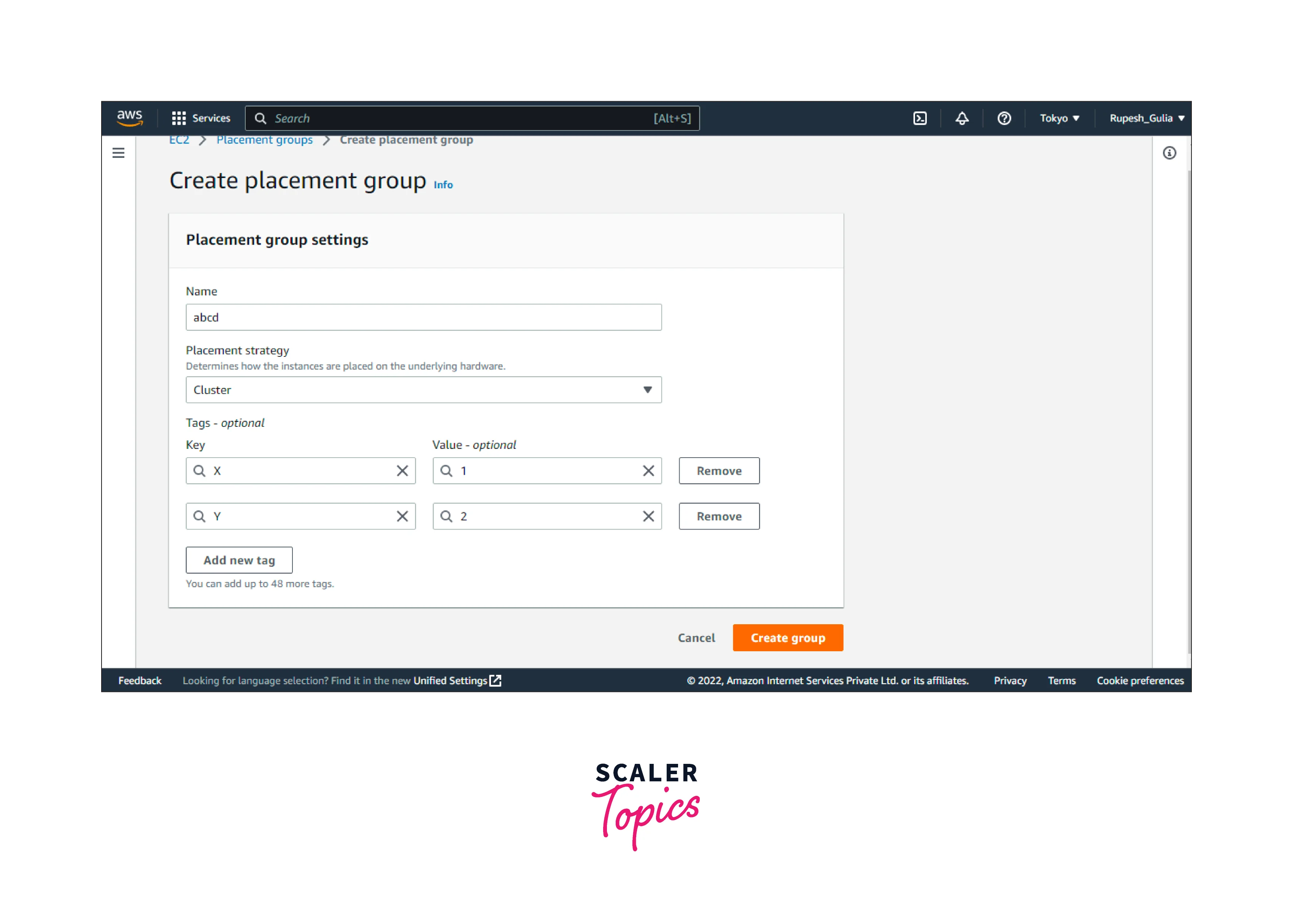 - The names that provide a placement group must be distinct throughout the AWS account again for Region.