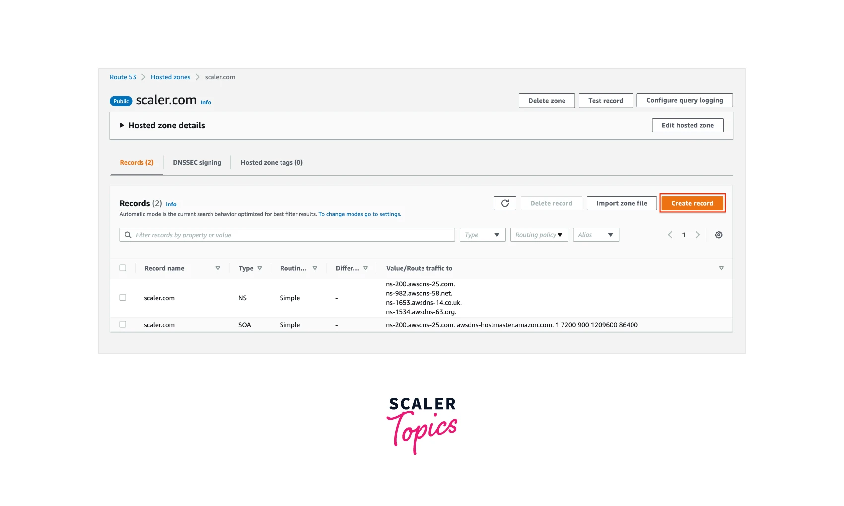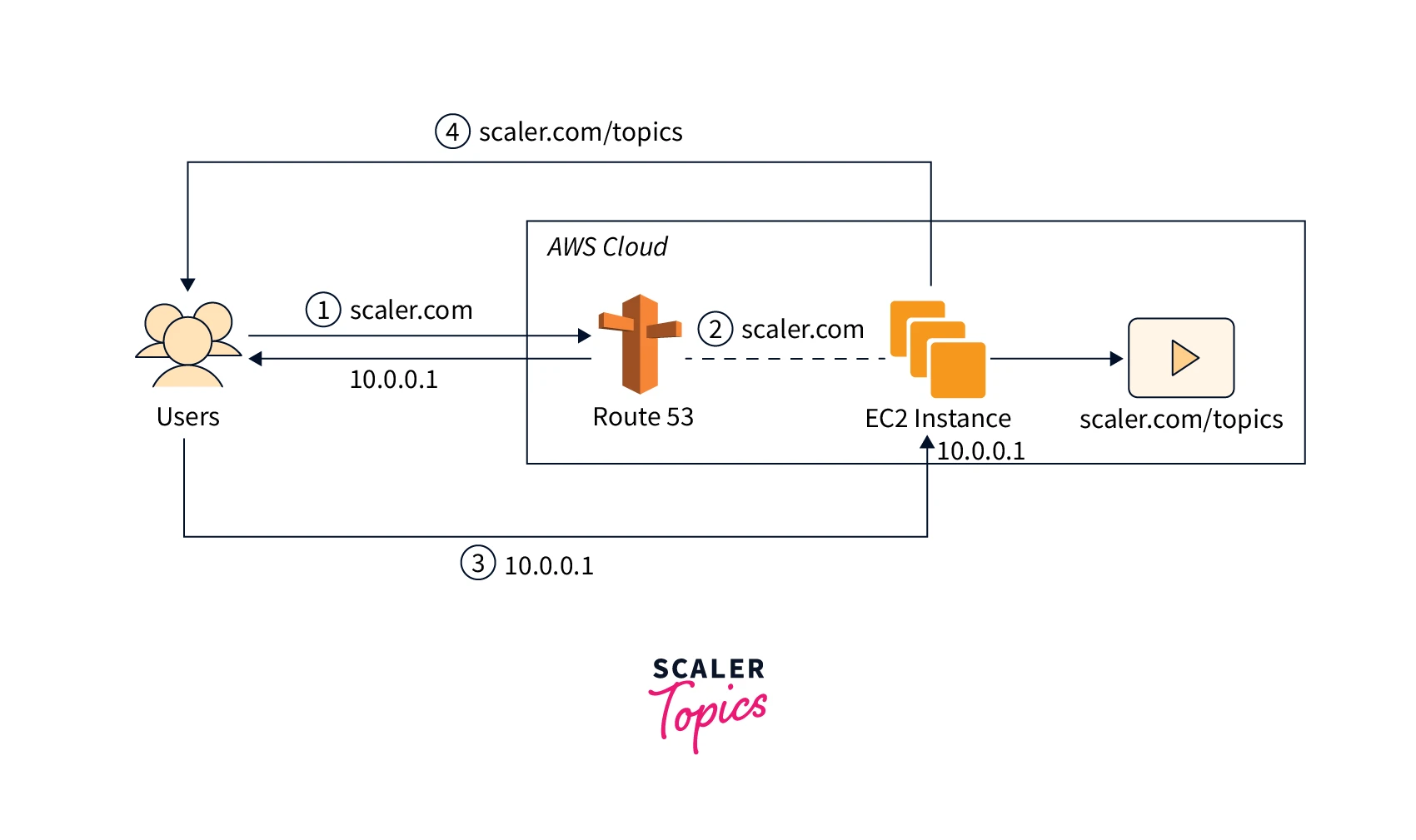 Note: This is an example and a simplistic representation of AWS Route 53 using Scaler Topics as an example and does not mean Scaler Topics uses exactly this design.