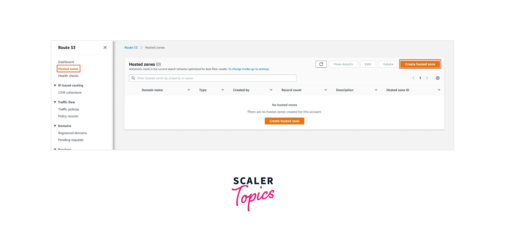- Select the Hosted Zones from the navigation bar on the left. Then click the Create hosted zone button.