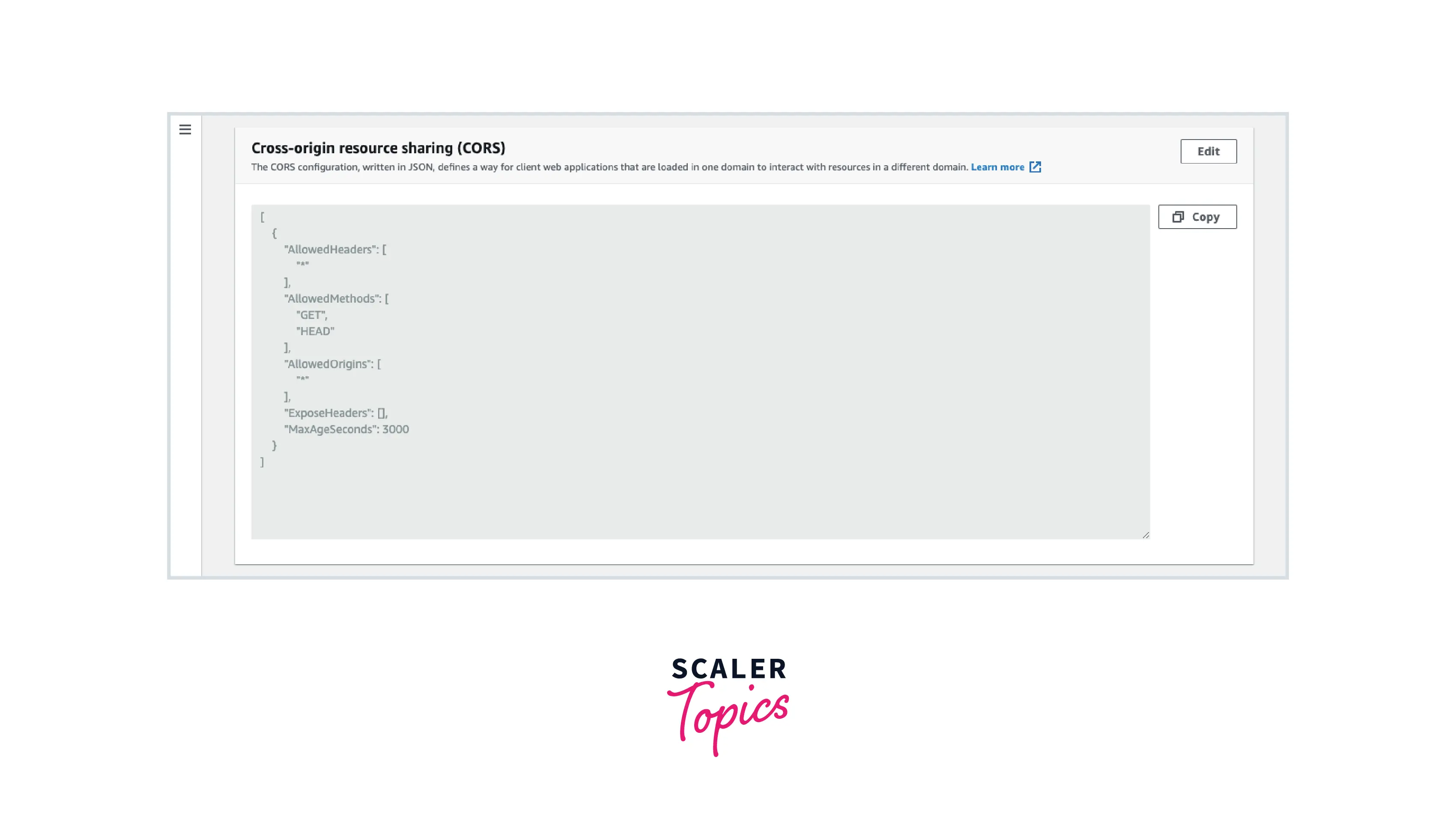Consider the following example to understand the CORS configuration where PUT, POST, and DELETE methods are allowed from cross-origin requester www.scaler.com: