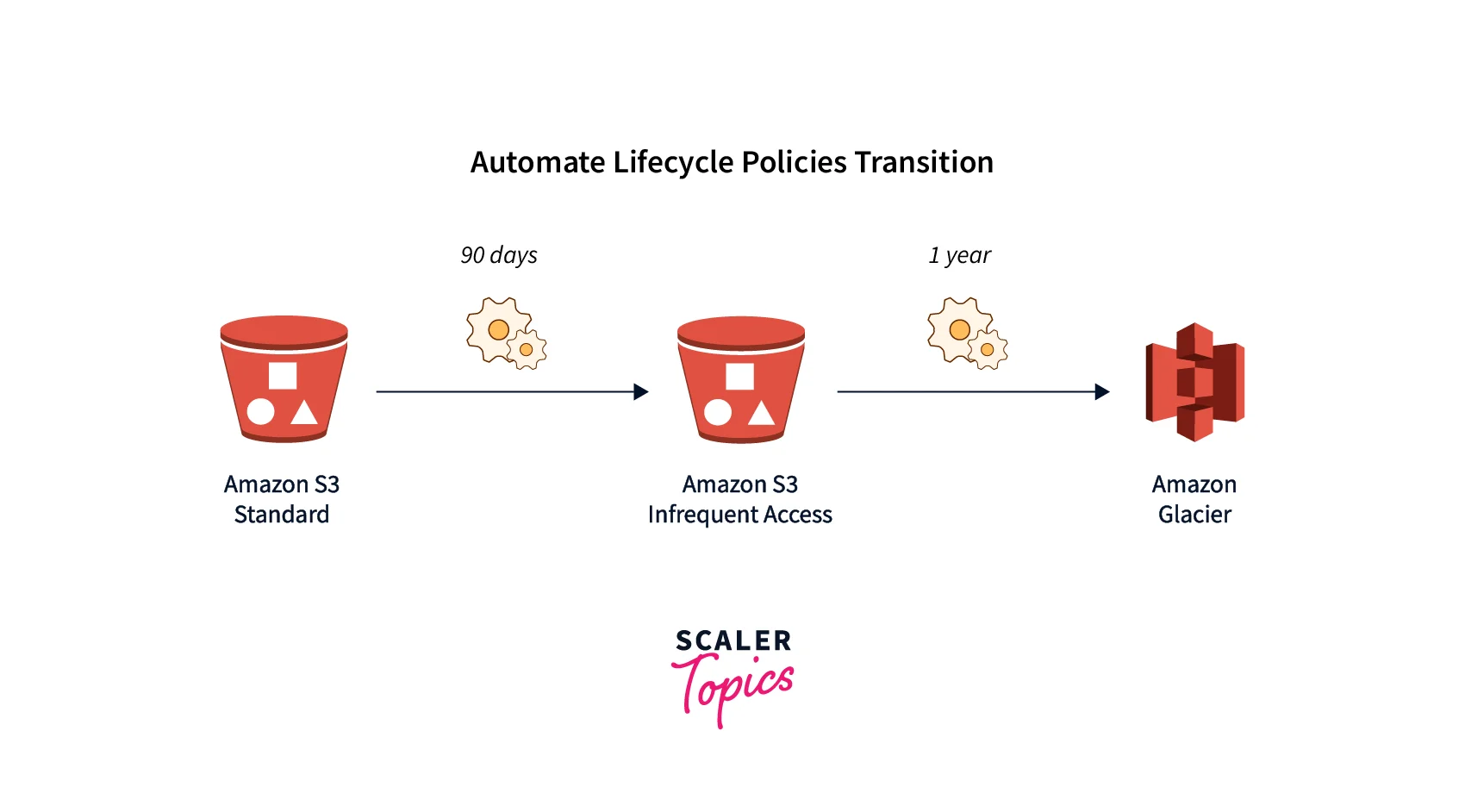 Automatic transition to tiered storage: AWS S3 Lifecycle Policy allows you to migrate items to the Standard IA storage class and then to the Glacier storage class.