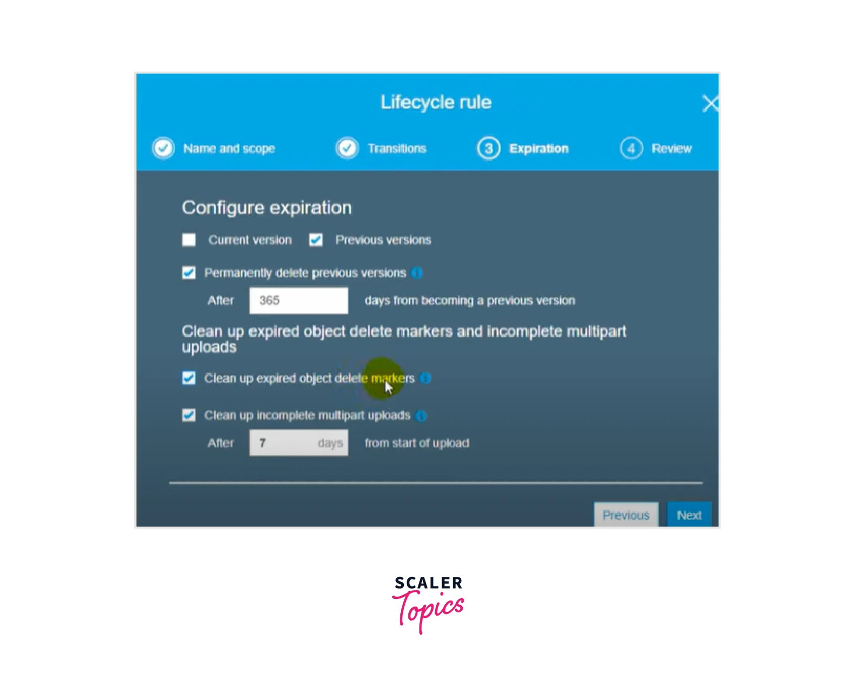 - The same AWS dashboard can be used to simply establish the AWS S3 Lifecycle Policy rule for deleting older versions of S3 items, as seen below.