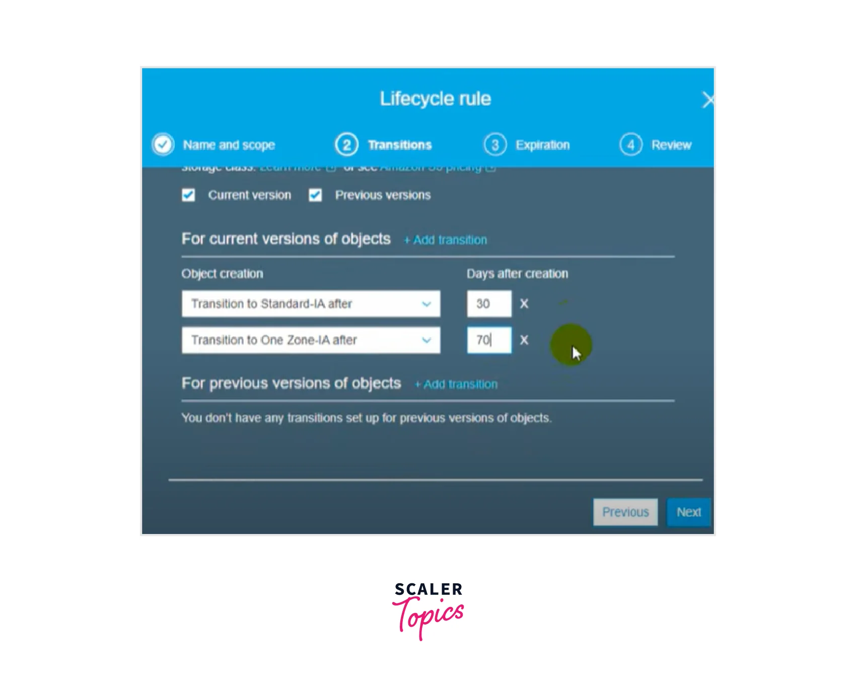 - Transitions can be set up for the most recent version of an item, a previous version, or both. Versioning allows you to keep many copies of a single object together in a single bucket.