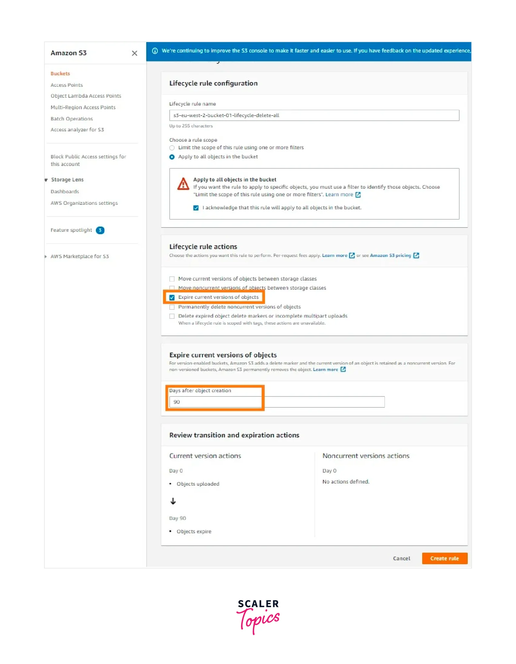 - The screenshot below demonstrates how to use the Amazon S3 console UI (accessible through the "Management" tab inside the S3 bucket) to define an AWS S3 Lifecycle Policy rule to expire the current version of S3 objects.