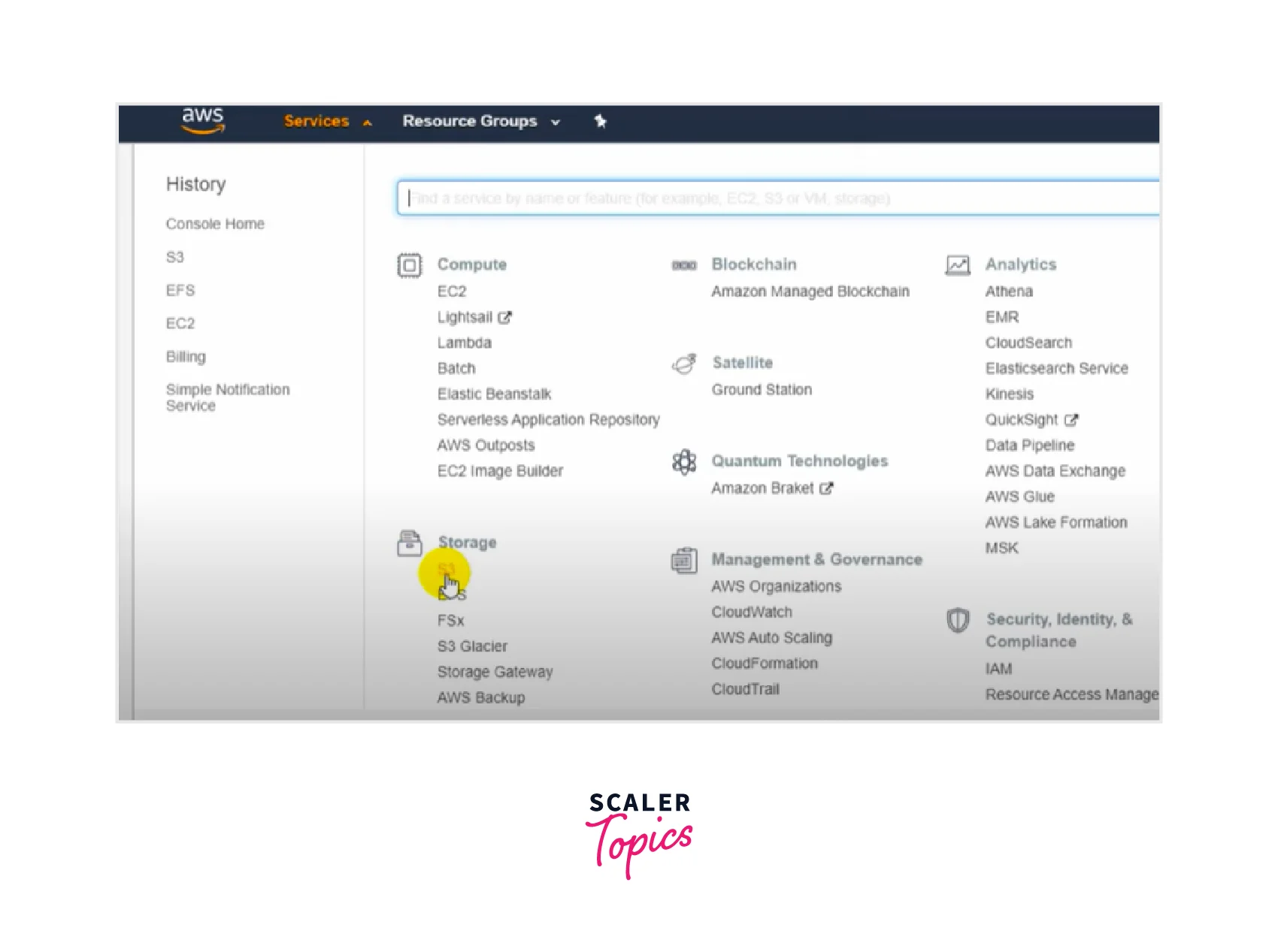 Step 1: Log in to AWS and navigate to services, then S3.