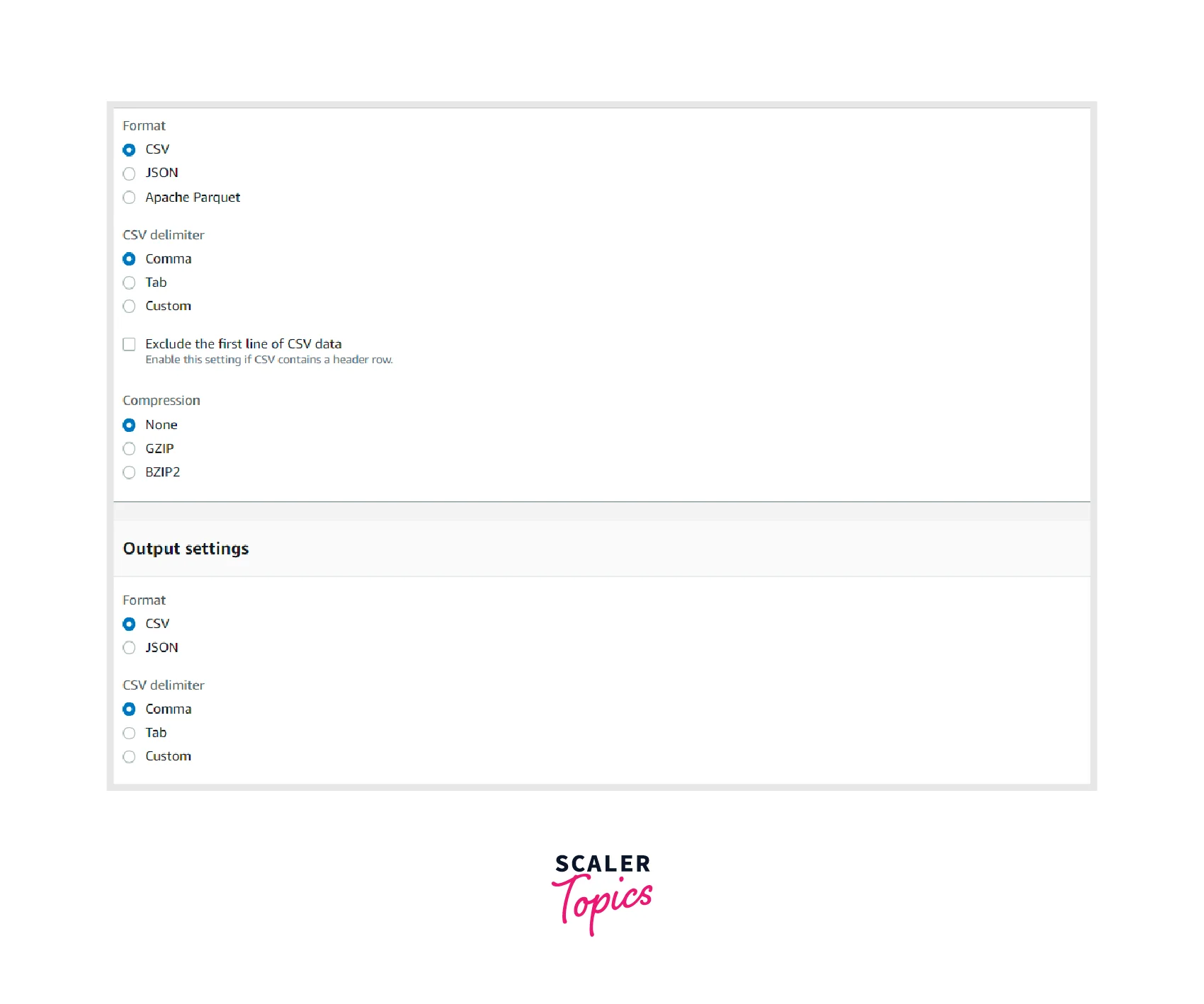 - Amazon S3 Select supports only CSV or JSON as output formats. It does not support Parquet output.