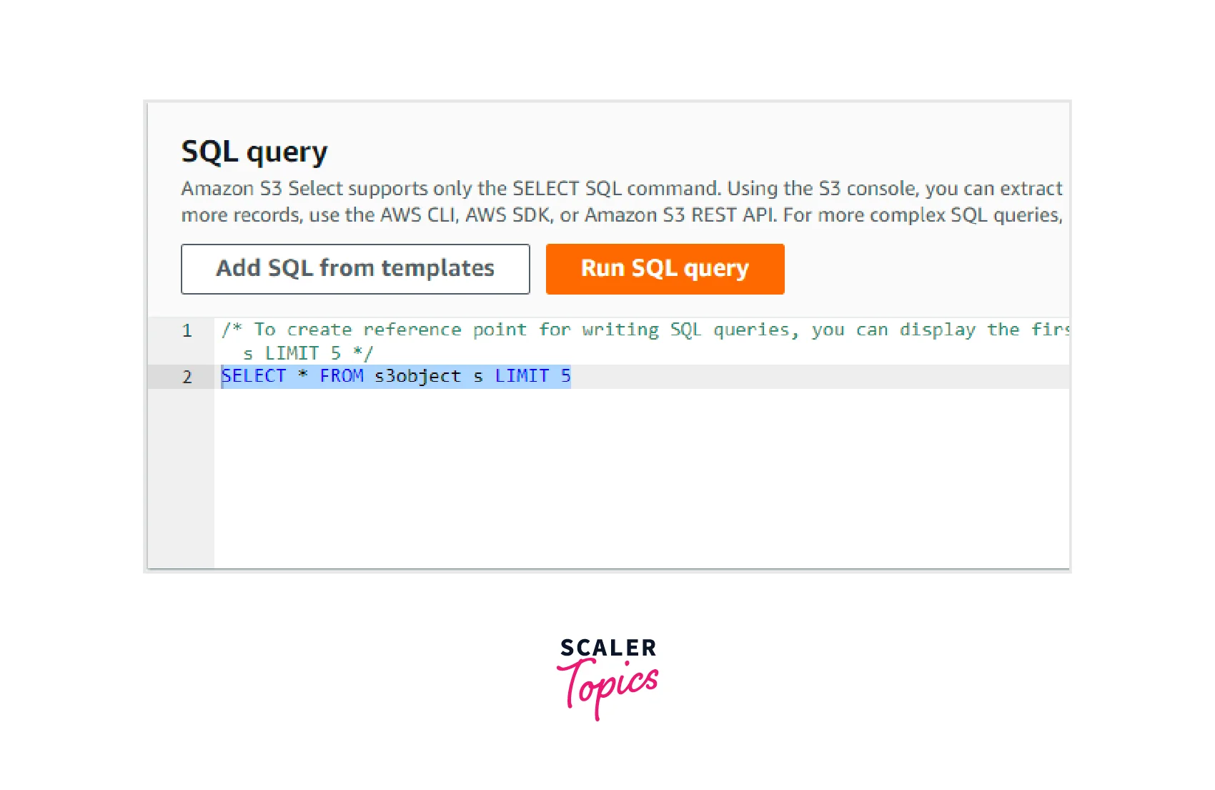 We have two options to perform an S3 Select query on S3 objects. They are the AWS SDK and the Rest APIs.