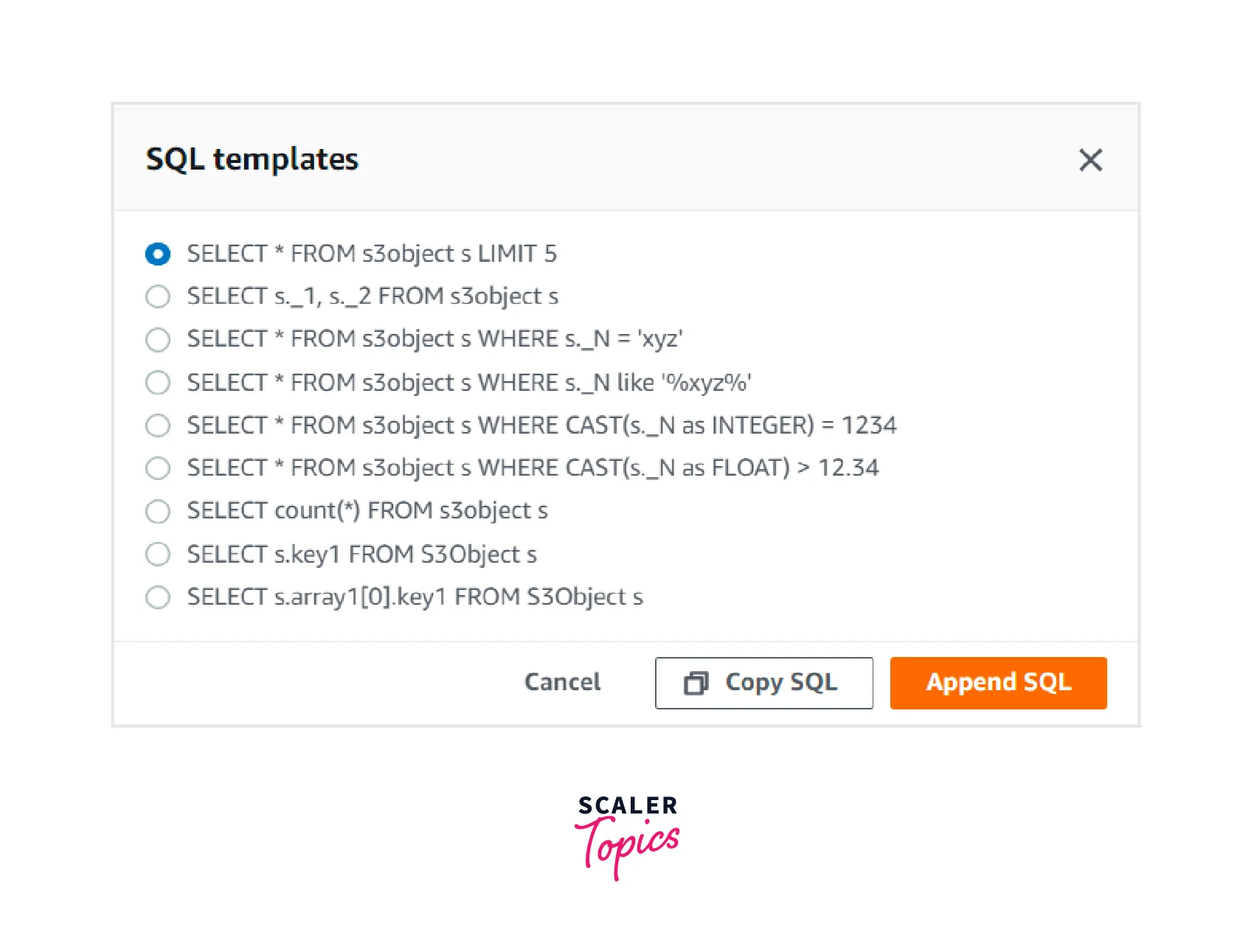 - Amazon S3 Select SQL expressions are highly optimized. As a result, it will take much less time than any other tool, such as Amazon Athena.