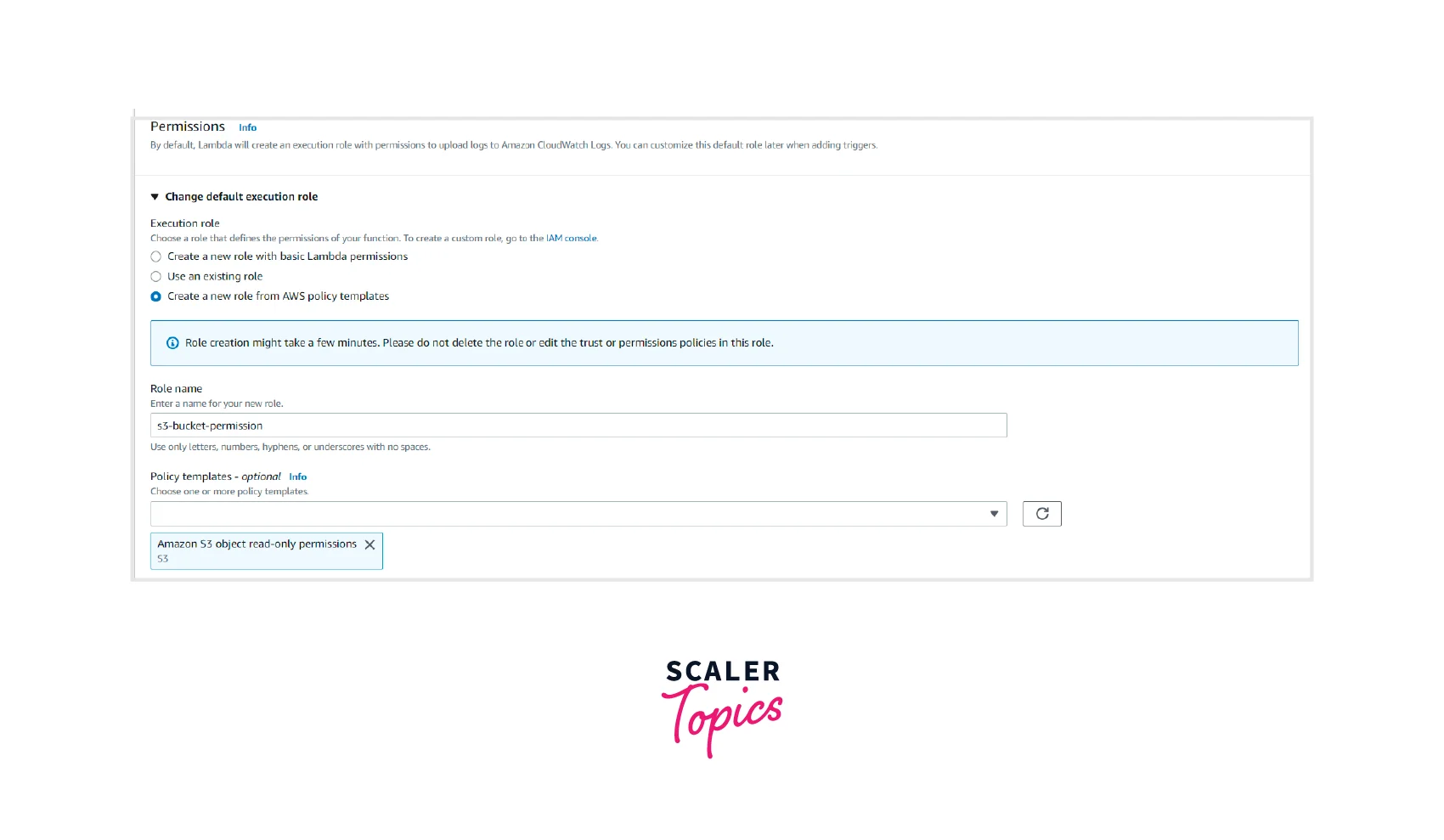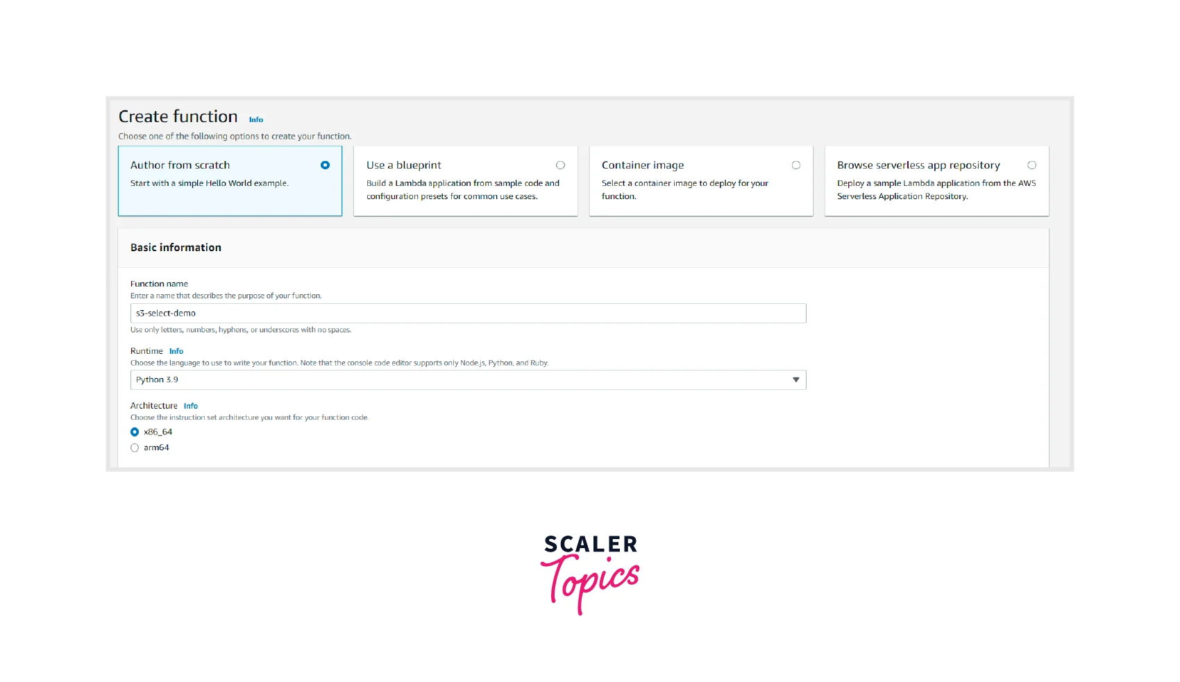 Option 1: Author From Scratch Name: s3-select-demo Runtime: Python 3.9 Architecture: X86_64 Permission: Create a new role from AWS policy templates