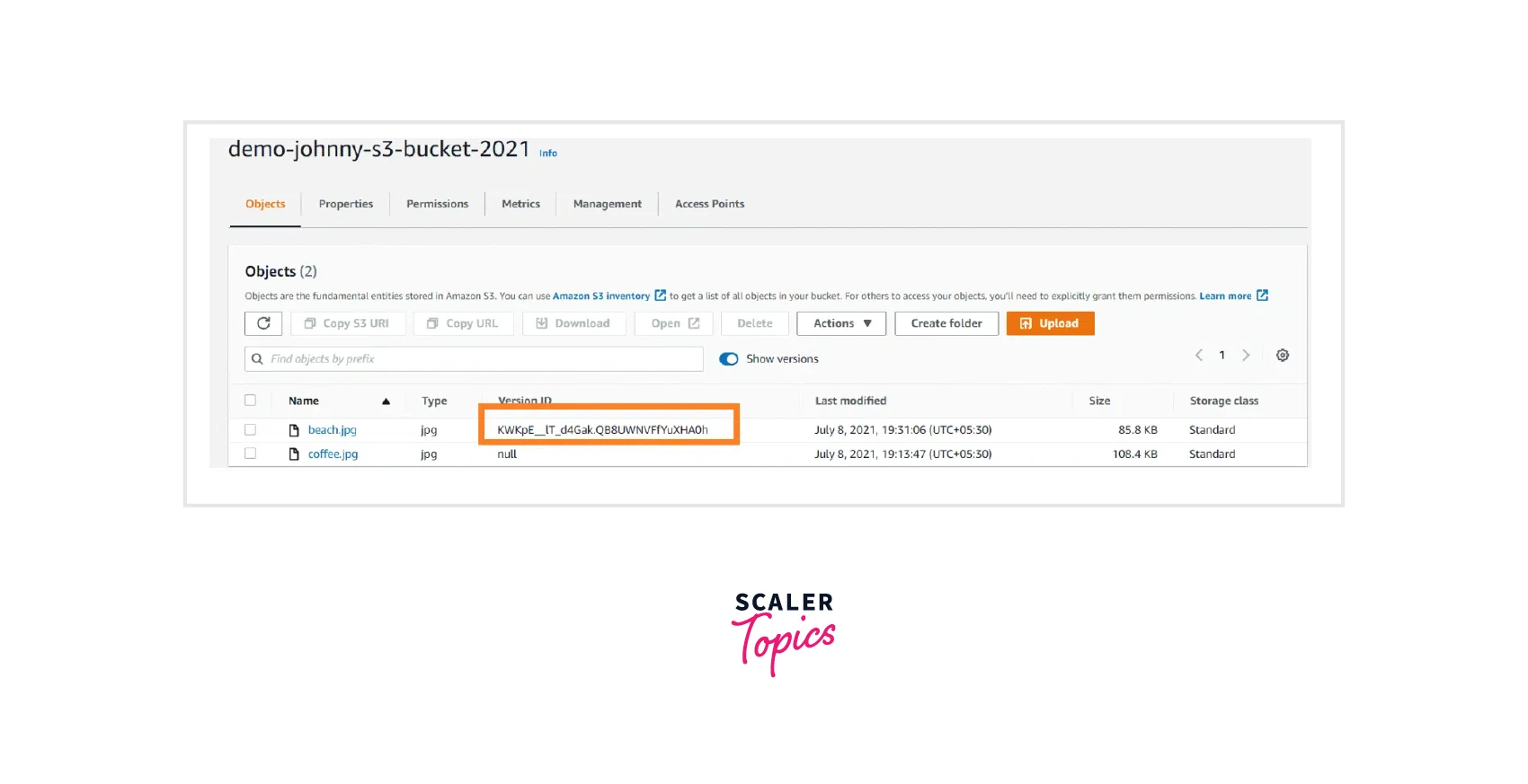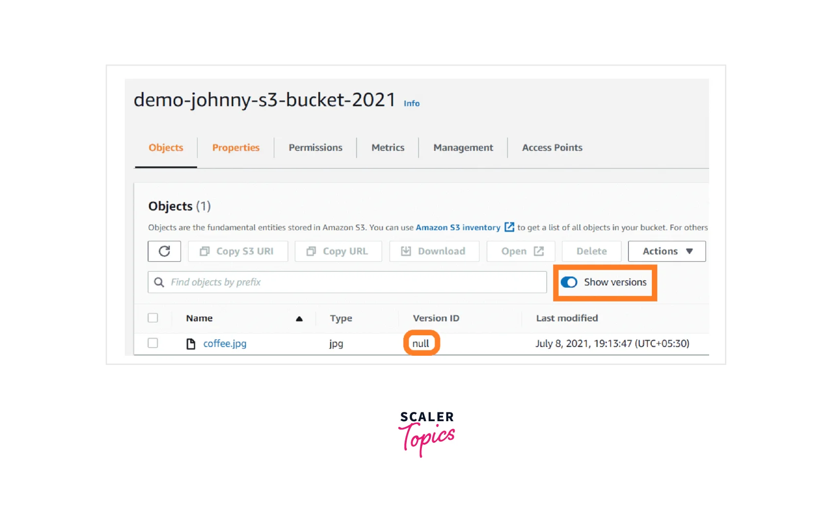 - Once enabled, you will see a new column named Version ID that displays the S3 object name. As the image (JPG image) was the first object, the version id will be null, This indicates that this file was uploaded to the S3 bucket before versioning was enabled.