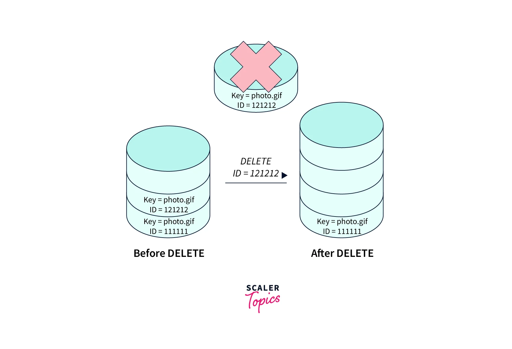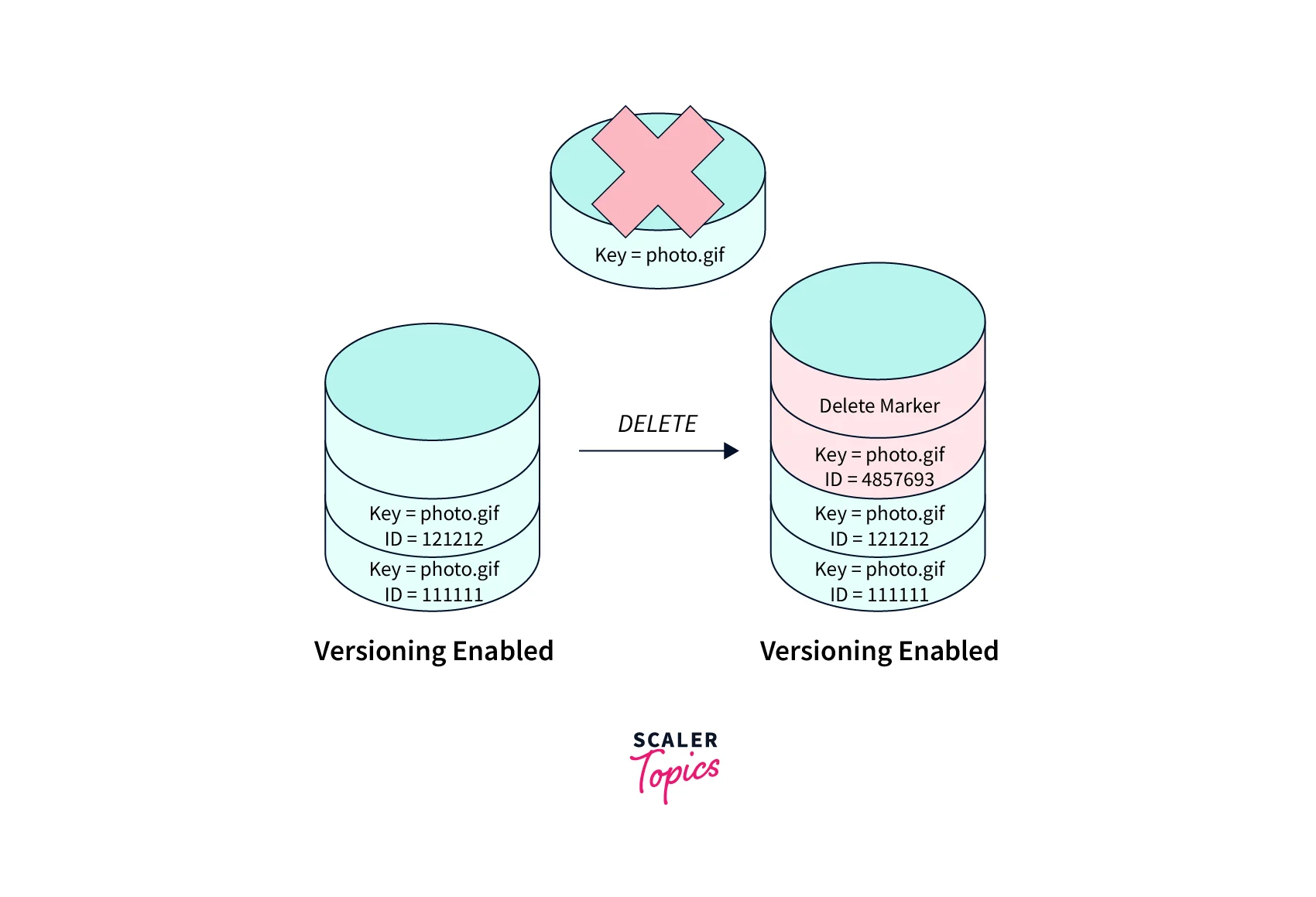 - When an S3 object is pushed for a 'DELETE' operation, all the existing versions remain as-is in the S3 bucket, while the AWS S3 inserts a delete marker for that object, as shown below. Also, now the delete marker becomes the current version of the object.
