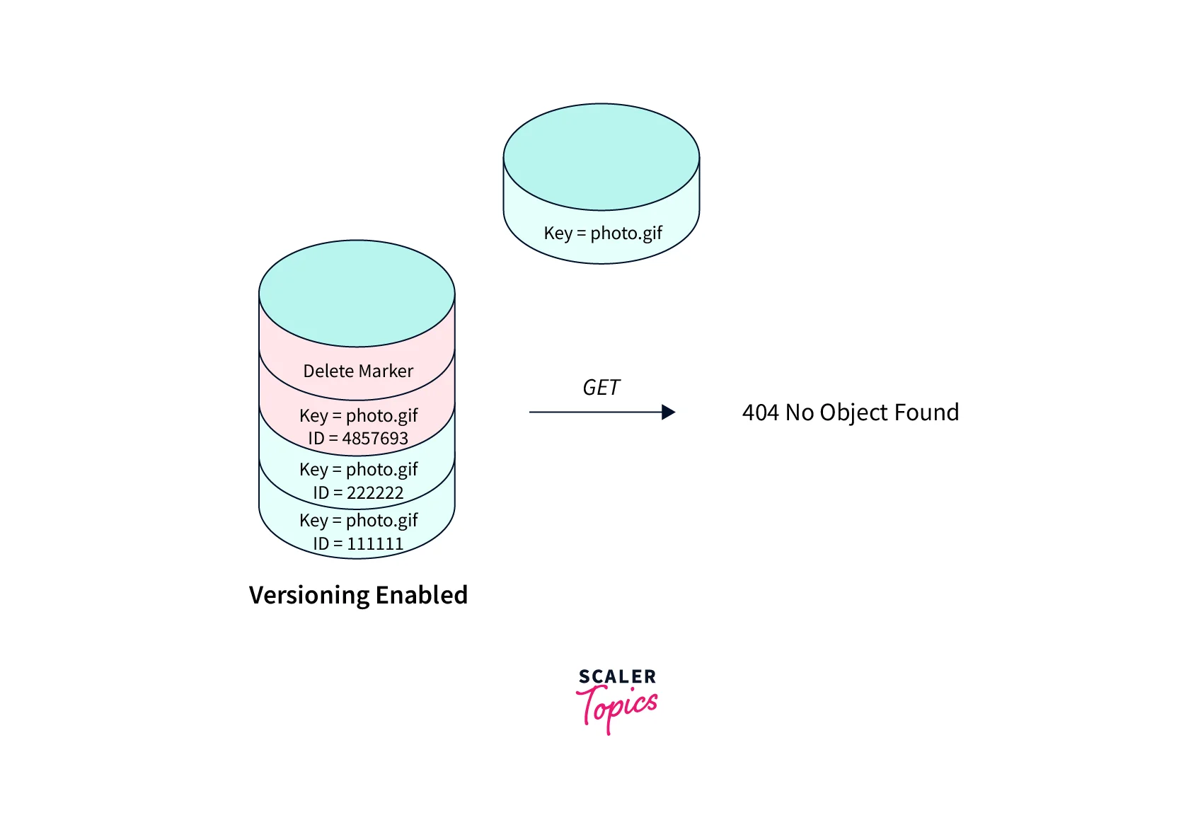 Case3: When you receive a 'GET' request, by default, the most recently stored version is sent in response. When the current version is a delete marker, and you receive a GET request, a 404 Not Found error, as shown below.