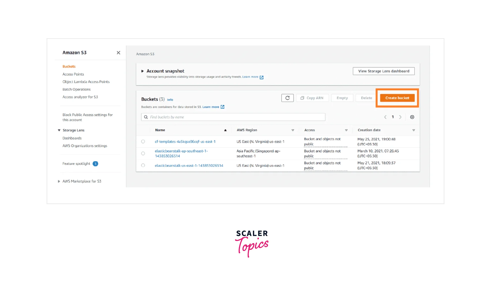 - login to the AWS Management Console and search S3 in the search box where you shall see the standard AWS S3 dashboard, start the creation of the S3 bucket by selecting ‘create buckets’ as shown below.