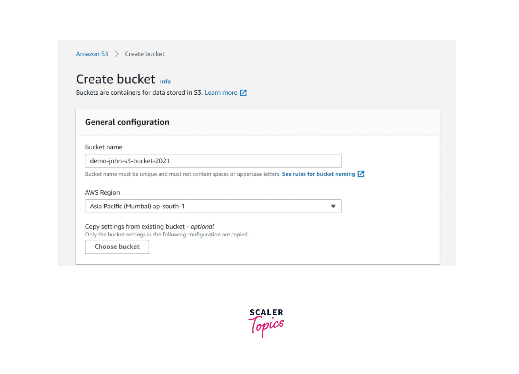 - Now move to select the ‘Region’ that is near to you, and specify the name (unique name to be allowed else the bucket doesn't get created) to your AWS S3 bucket. You can also select the ‘Create Bucket’ button, leave all the settings as default and scroll down as shown below.