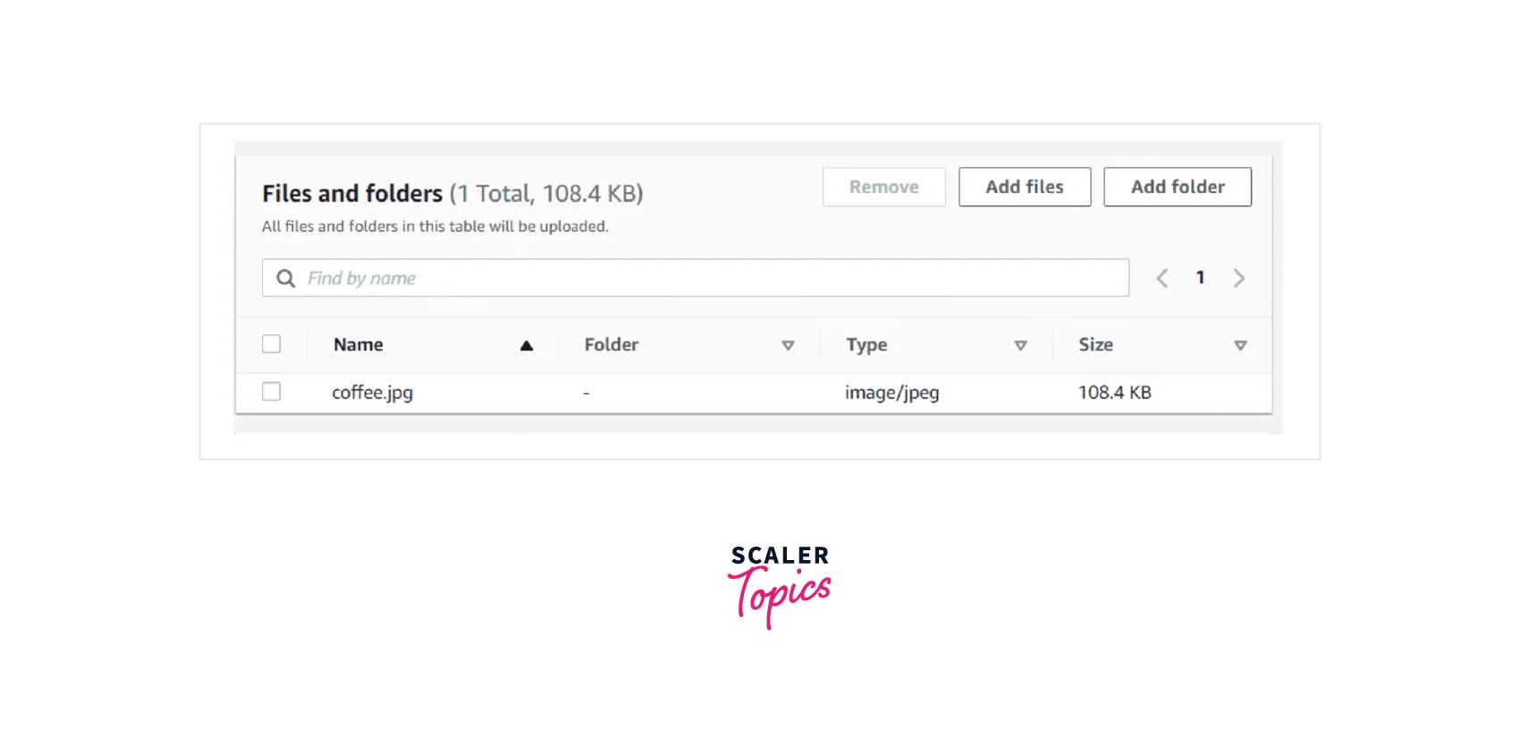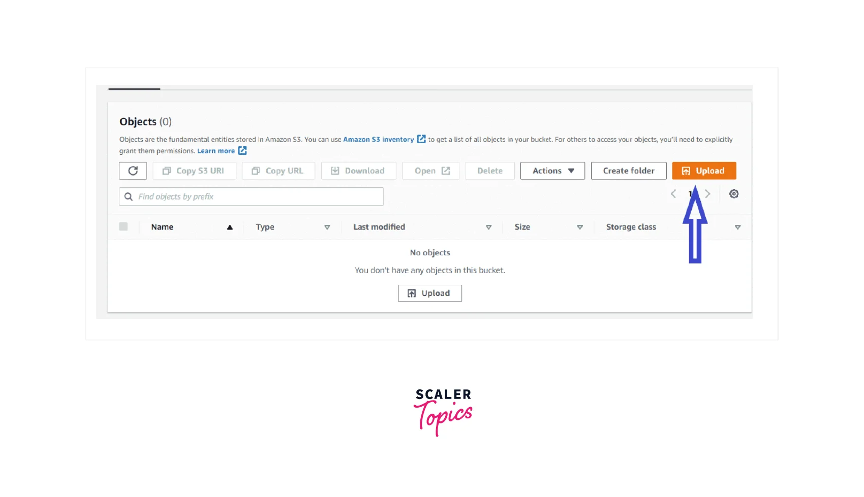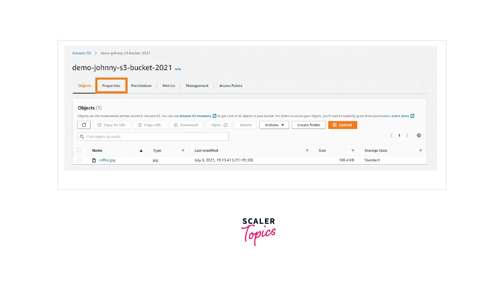 - You may find a list of various features offered in the S3 buckets like Metrics, Objects, Properties, Permissions, and others. Upload any file/ picture as the first object into the S3 bucket using the Upload option, we uploaded the JPG pic as shown below.