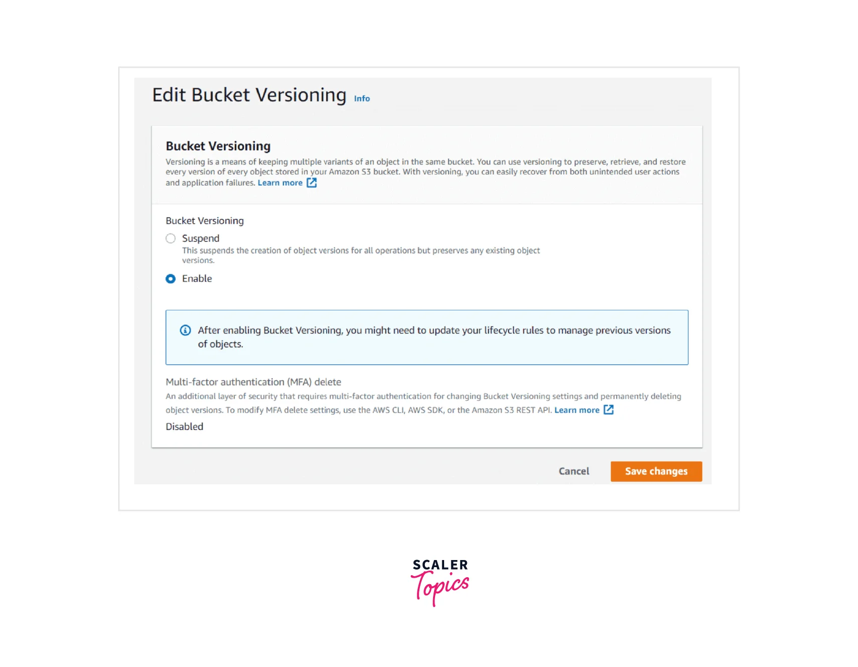 Note: The S3 bucket can never go back to an unversioned state, once the versioning is enabled on it. While if you want you can still move the same S3 bucket to the suspended version state.