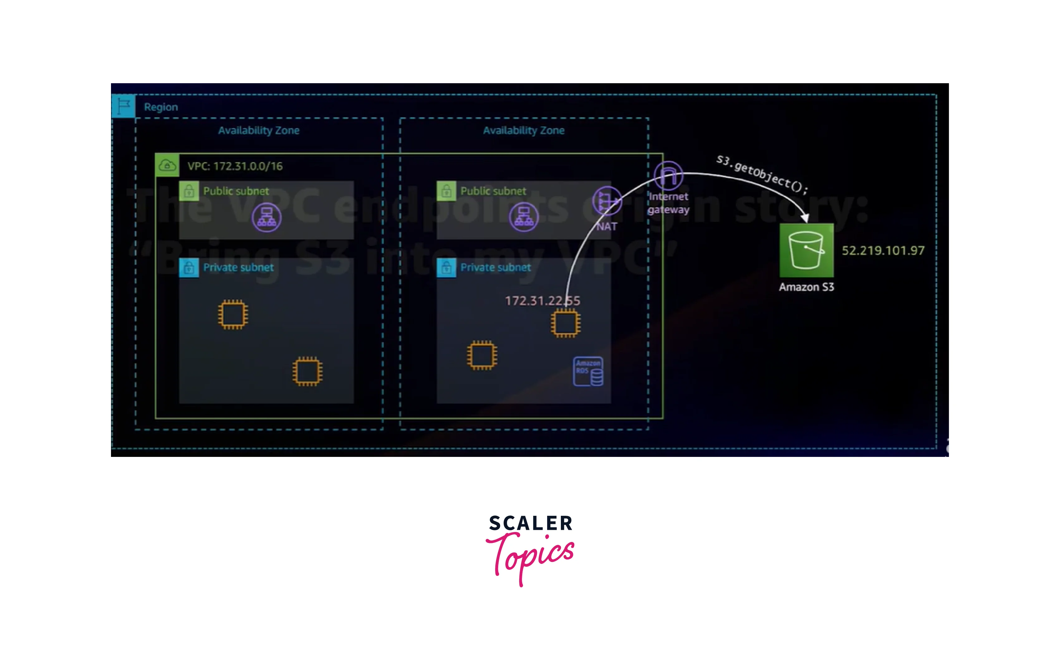 - In this image, the VPC endpoint components are not there. So when the request is initiated from the EC2 instance, it will route through the public internet and then reach the AWS Services.