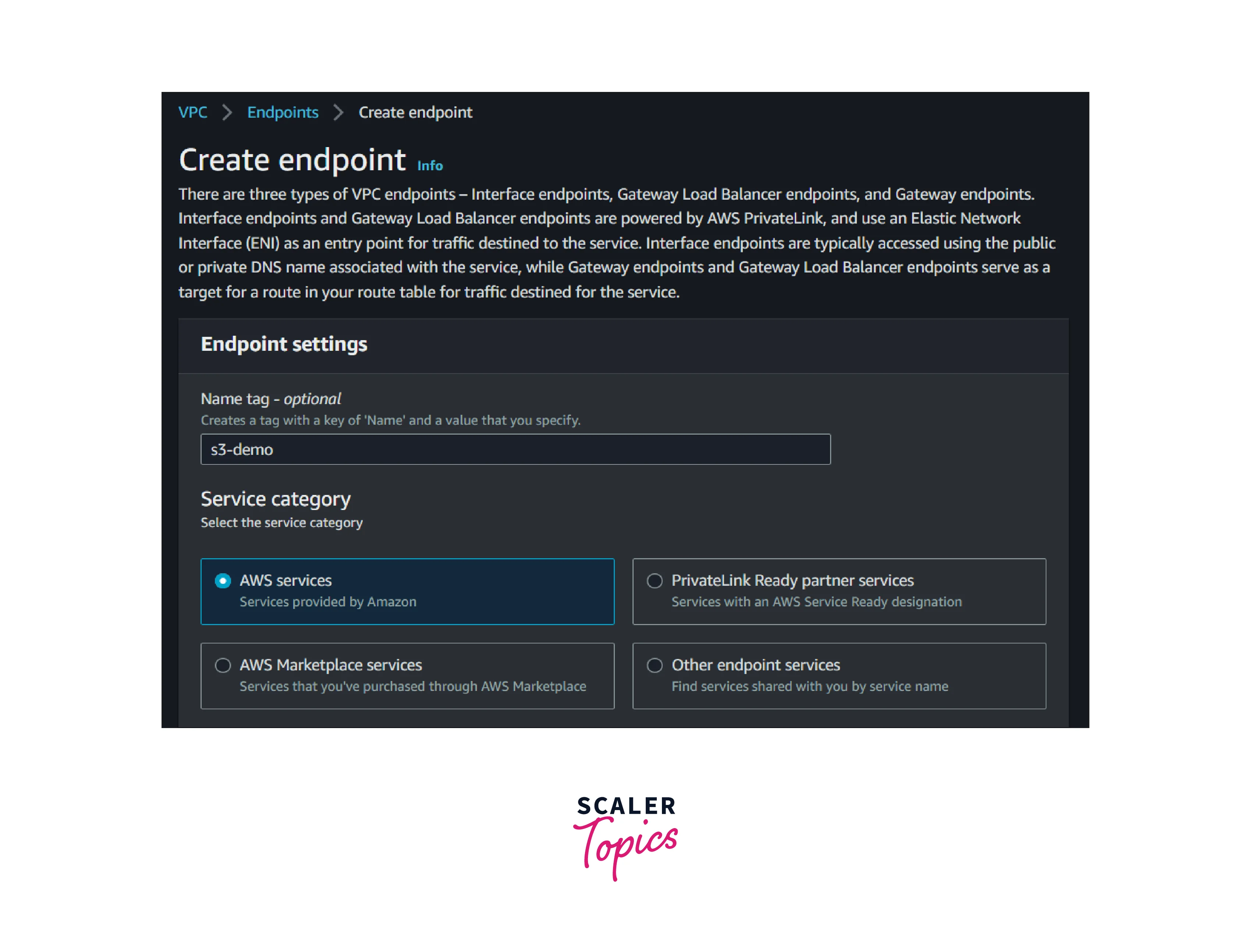 2. Enter the below name: S3-endpoint and choose AWS Service as the service category.