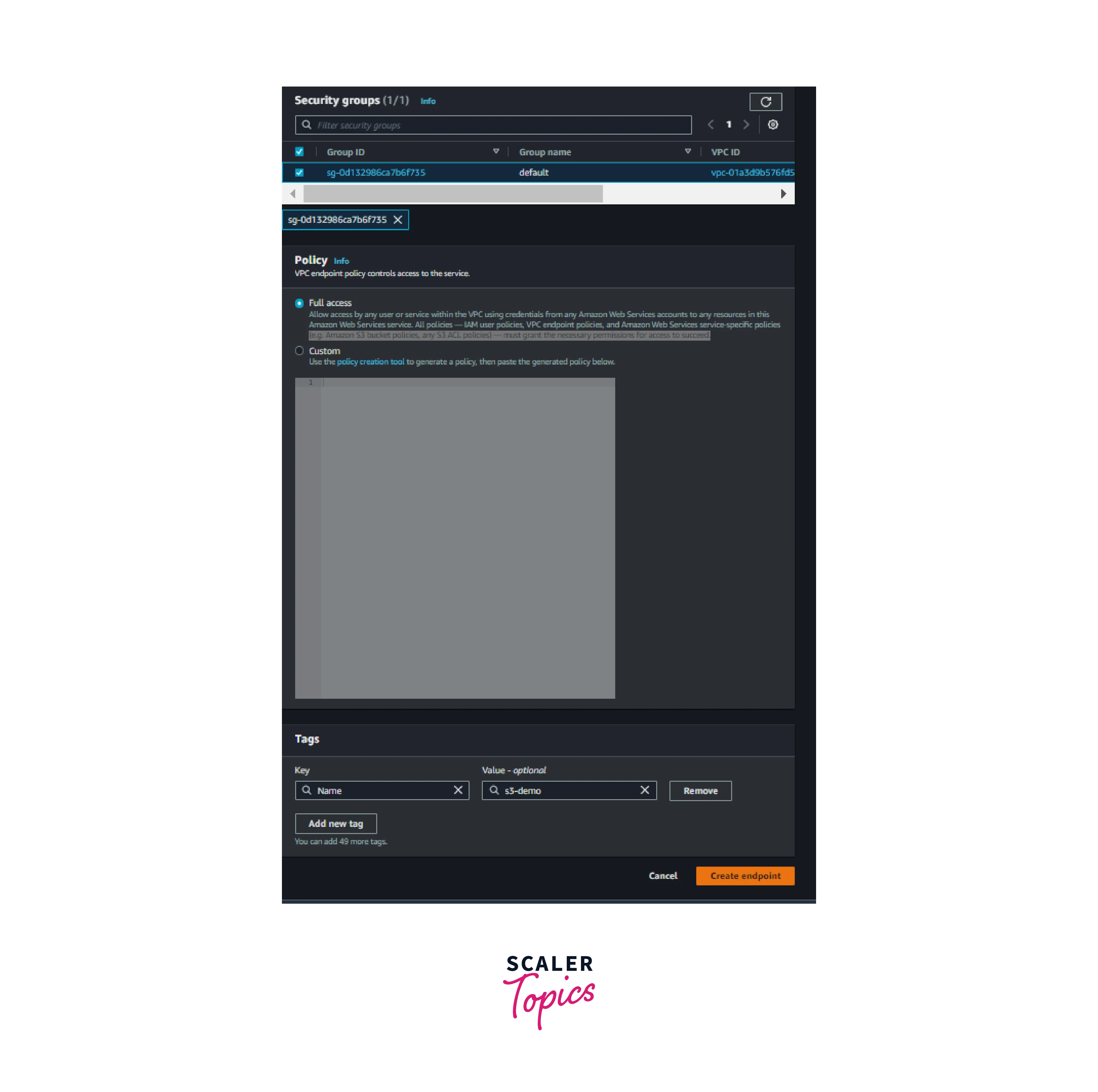 5. Select the Default security group and click Create Endpoints.we can also change the security group rules after the creation if required.