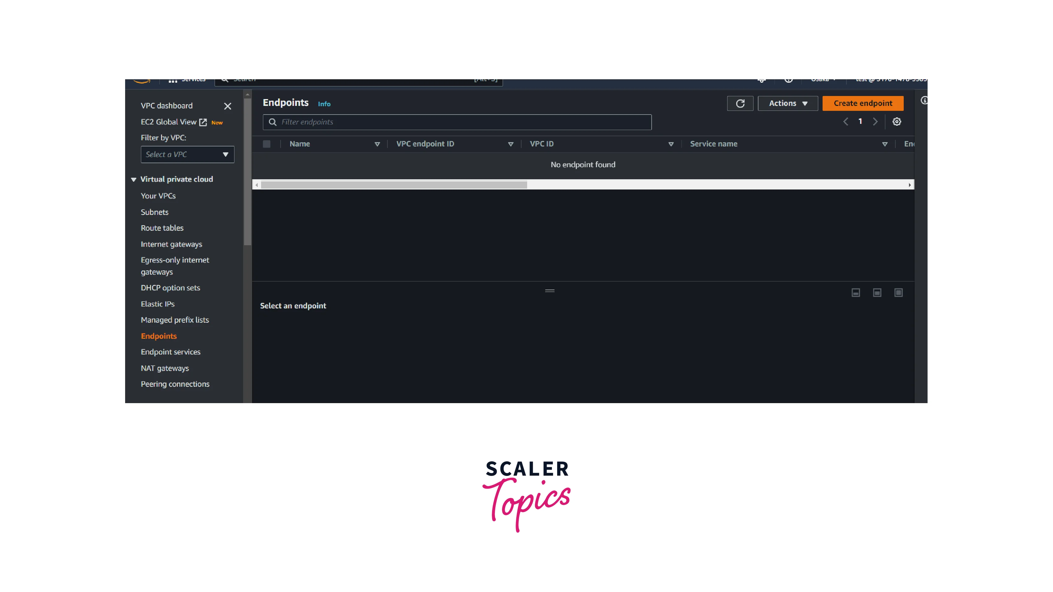 1. Go to the AWS VPC Console and select Endpoints in the left navigation pane. Then select the Create Endpoint button.