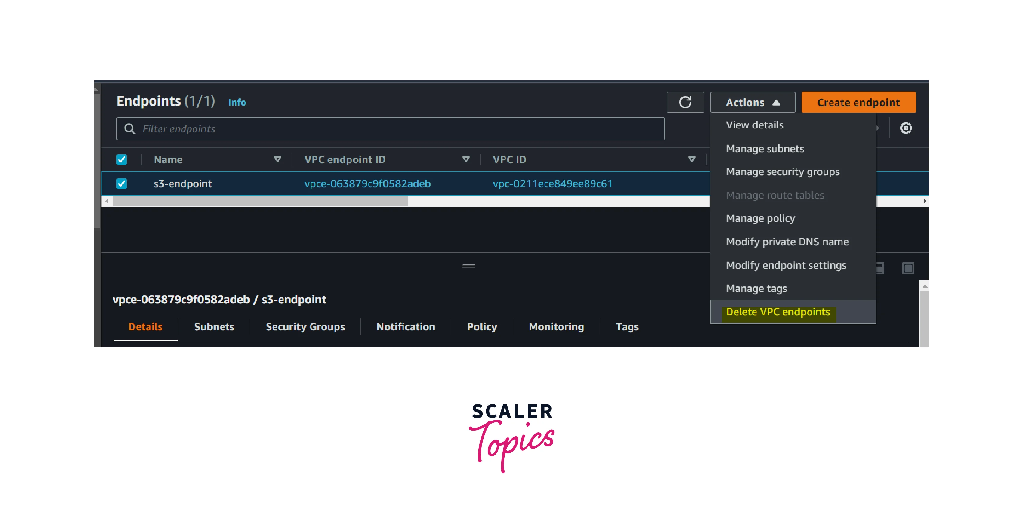 - Go to the AWS VPC Console and select the endpoint in the left navigation pane. Then Select the VPC endpoint that you want to delete and click Action.